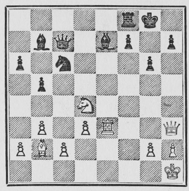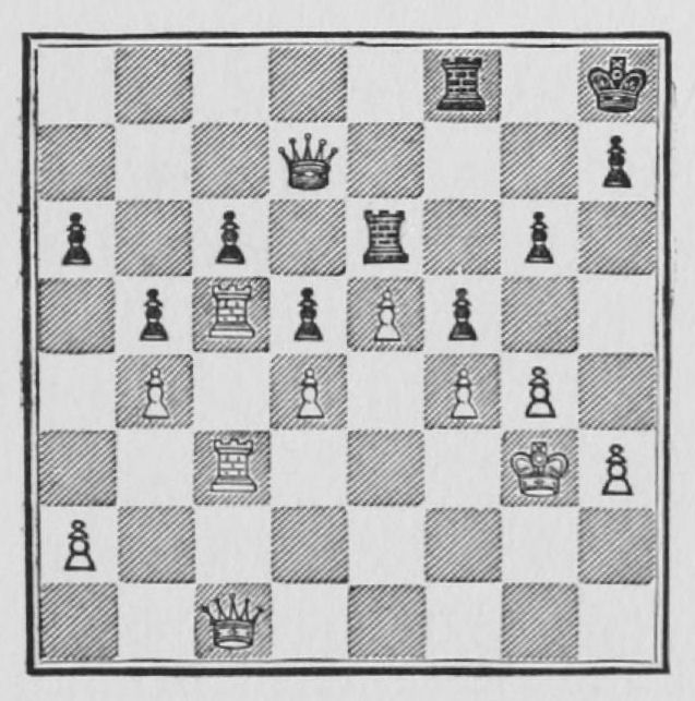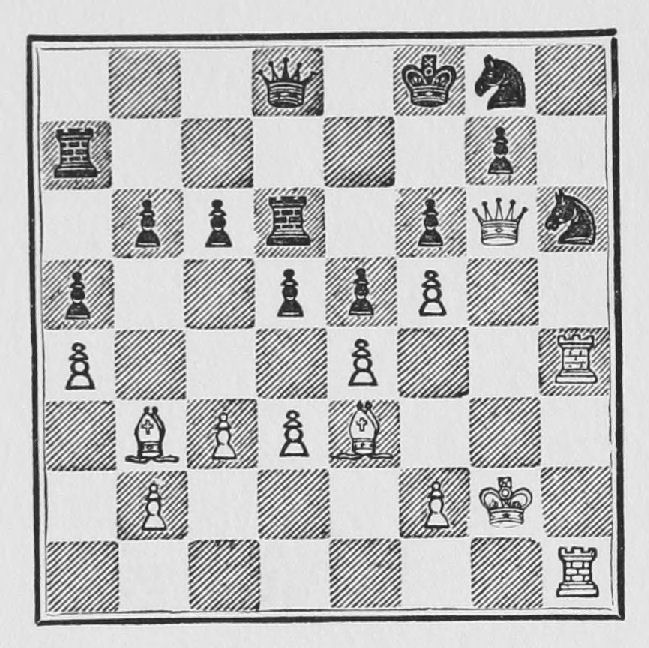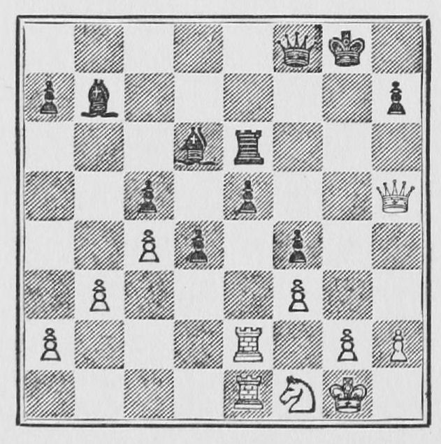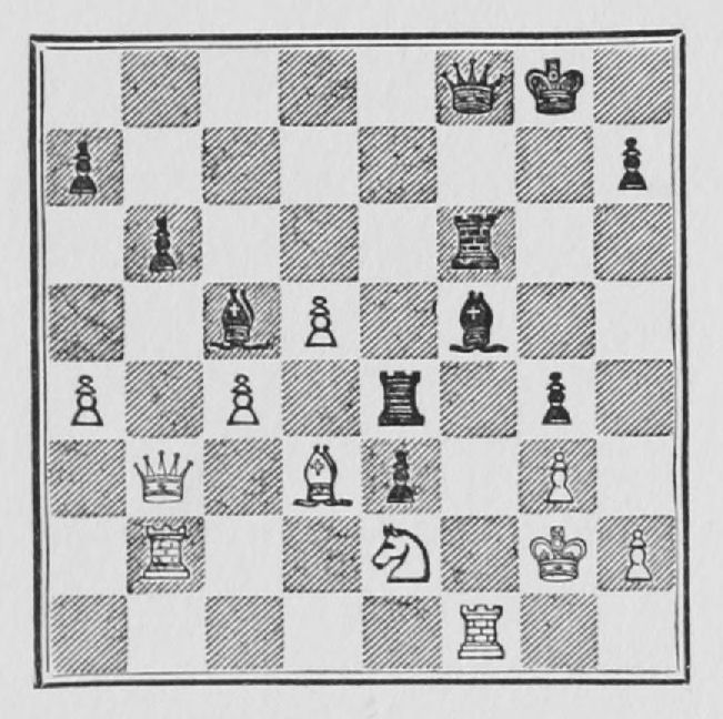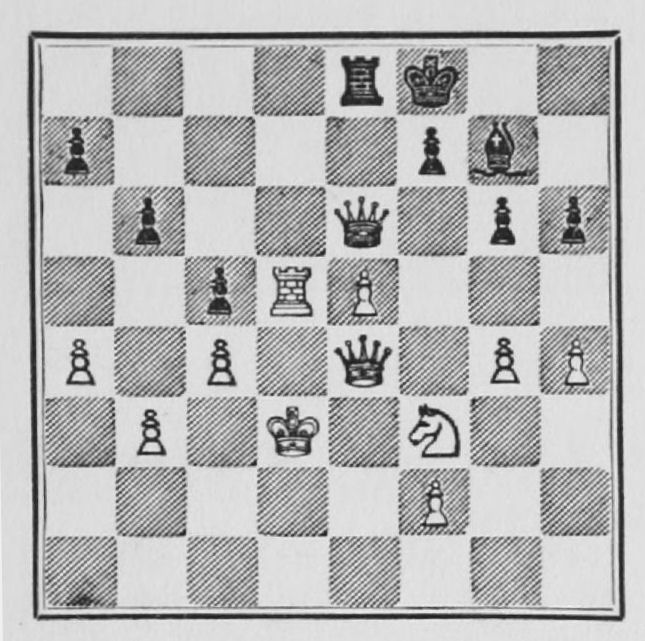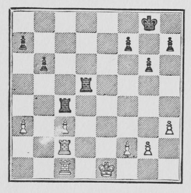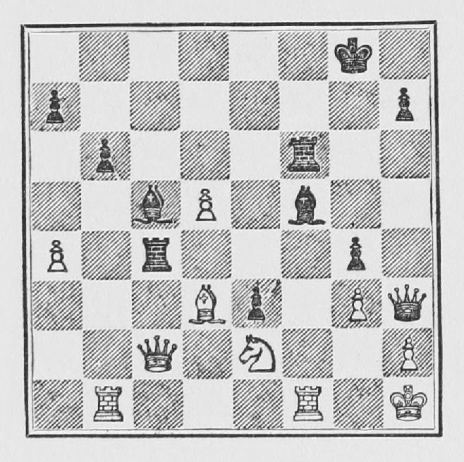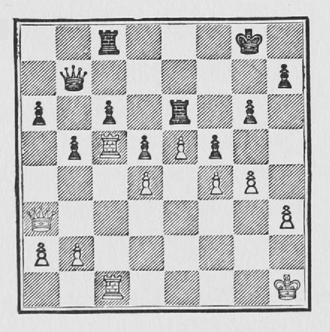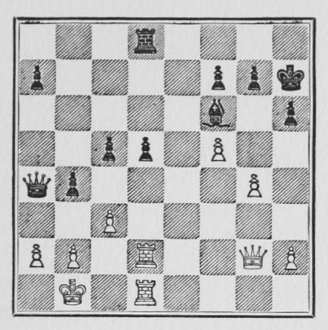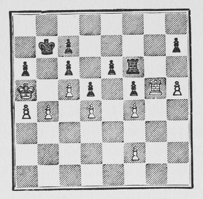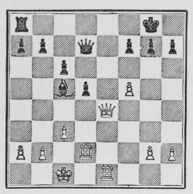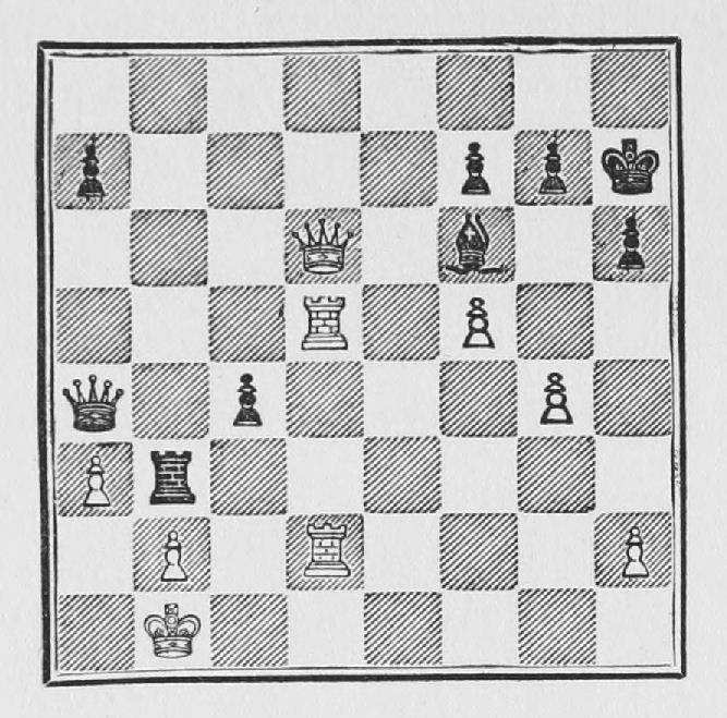 Notice the remarkable position of the pieces. White cannot move anything without incurring some loss. His best chance would have been to play 29 P - K 6, but that would only have prolonged the game, which is lost in any case.