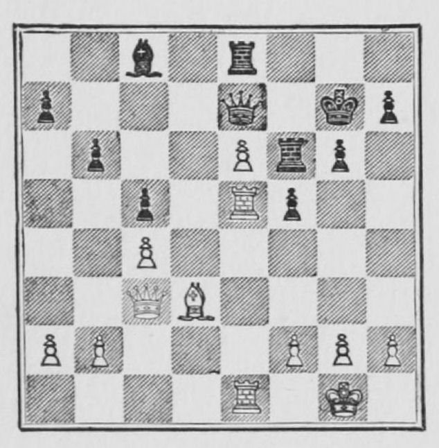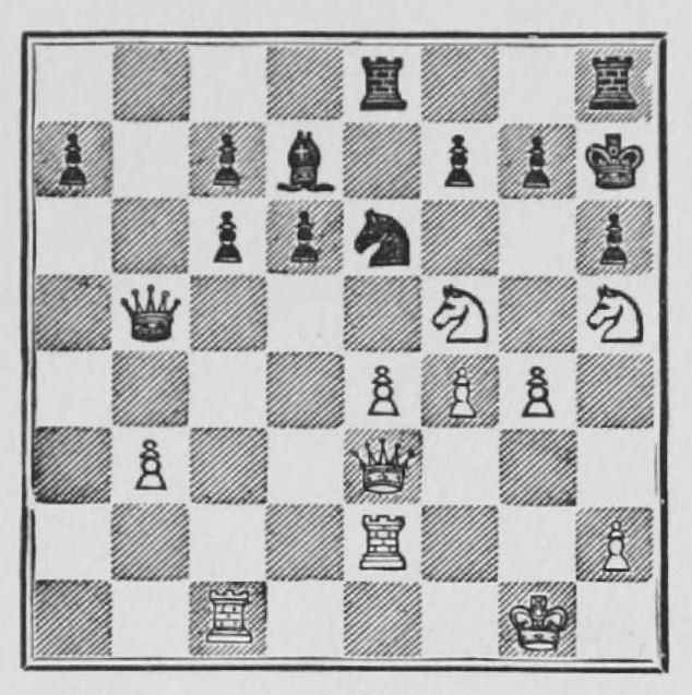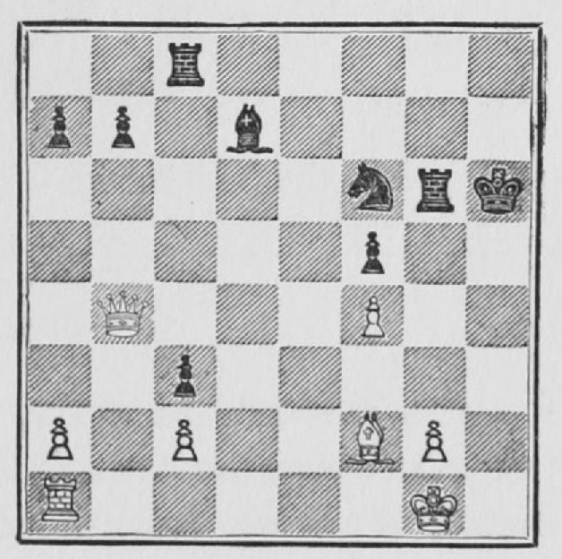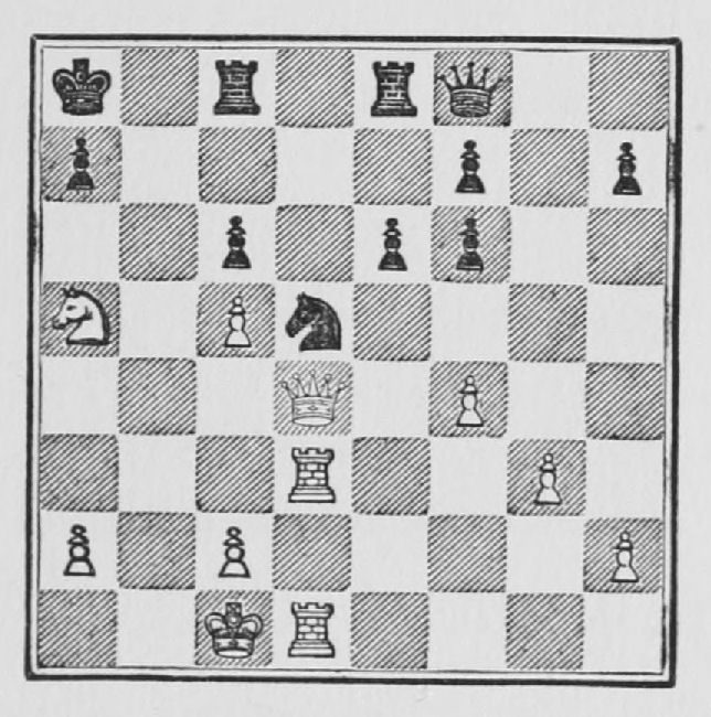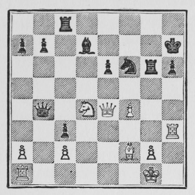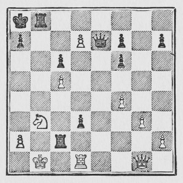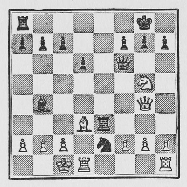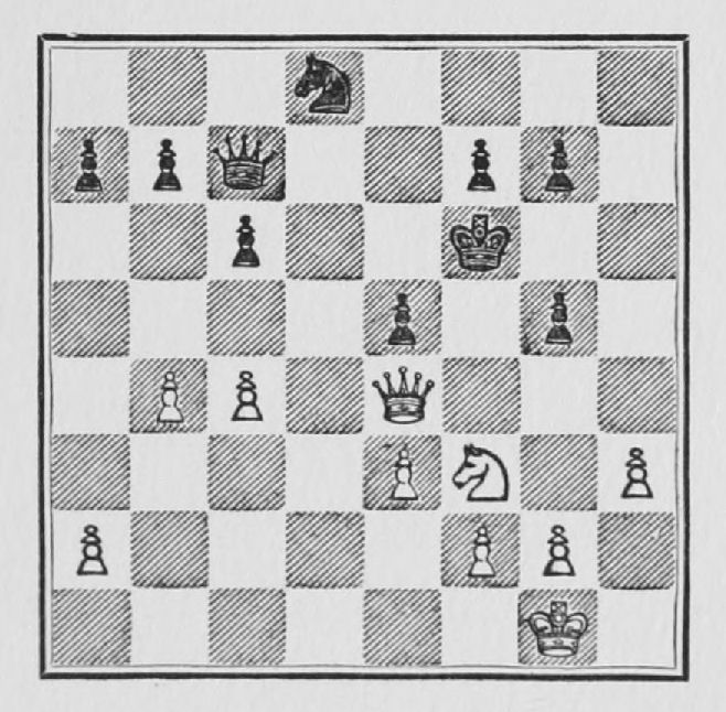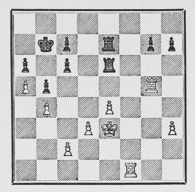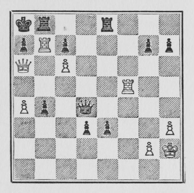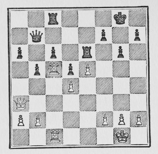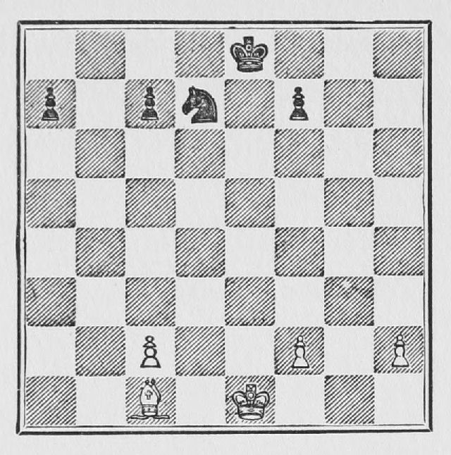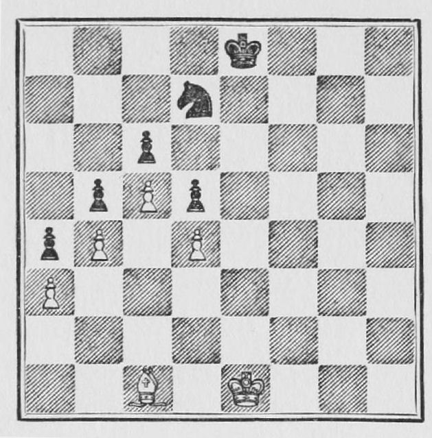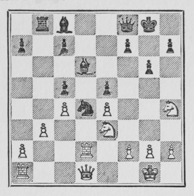 Notice the remarkable position of the pieces. White cannot move anything without incurring some loss. His best chance would have been to play 29 P - K 6, but that would only have prolonged the game, which is lost in any case.