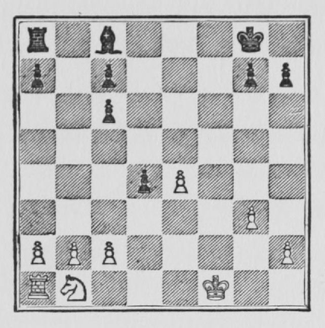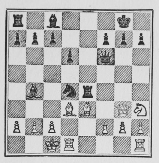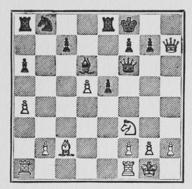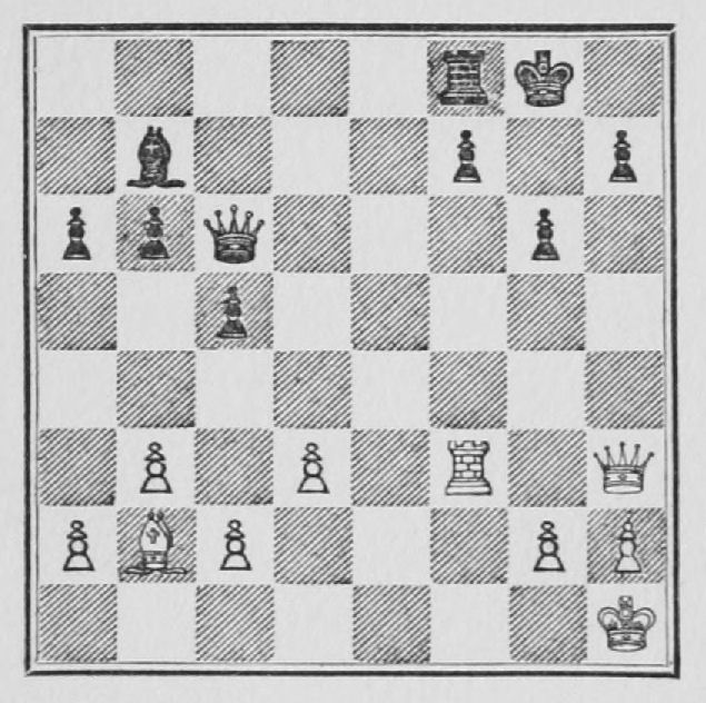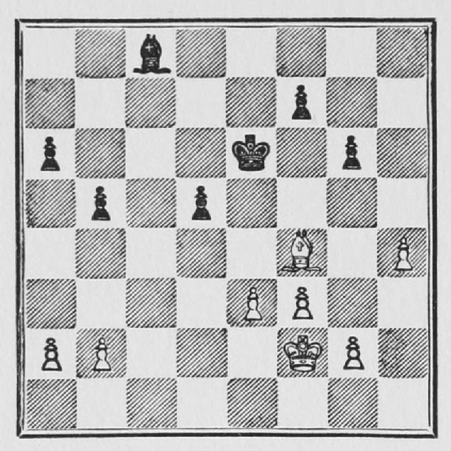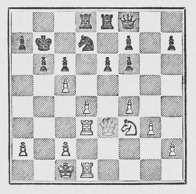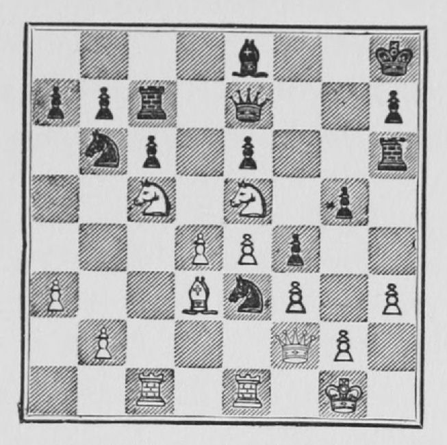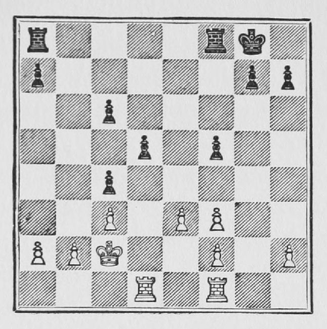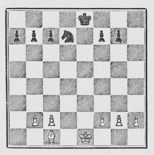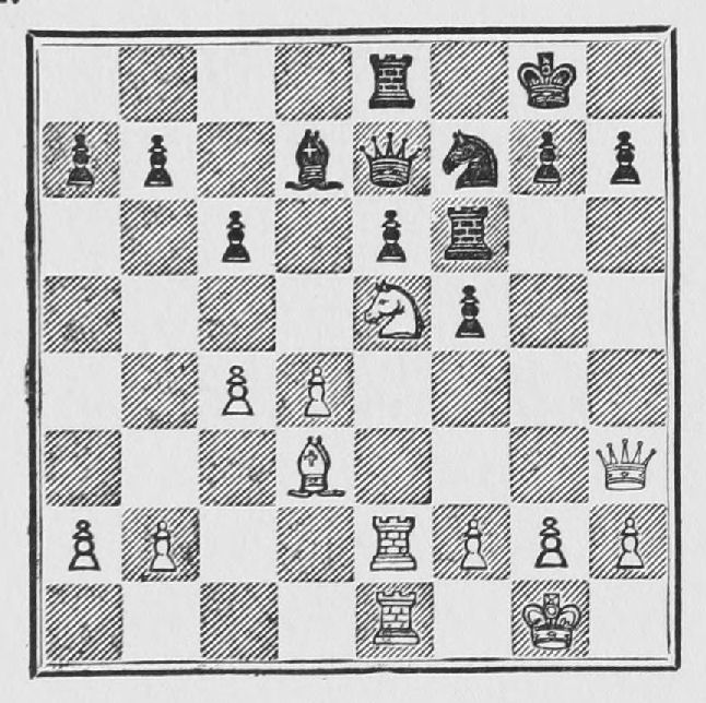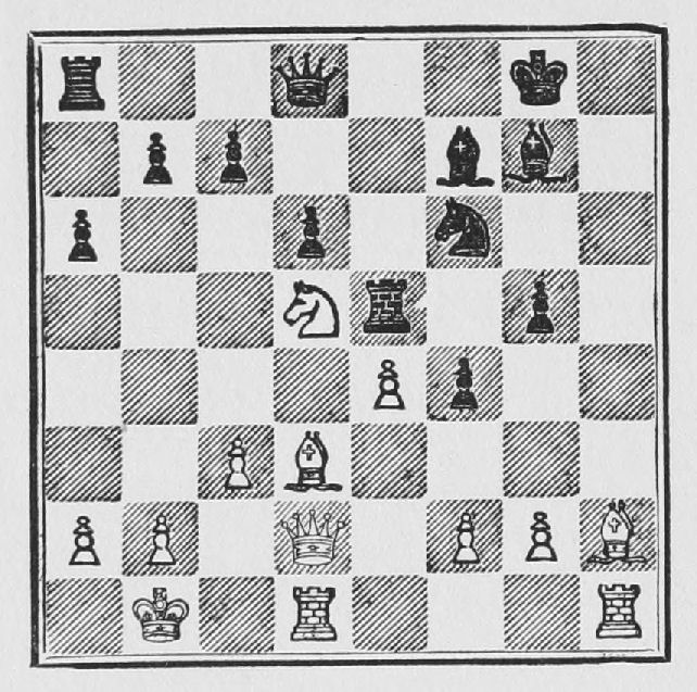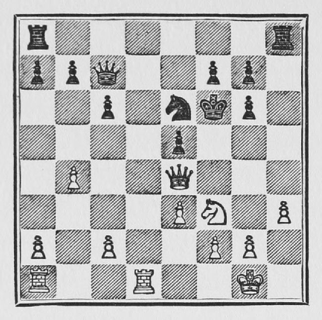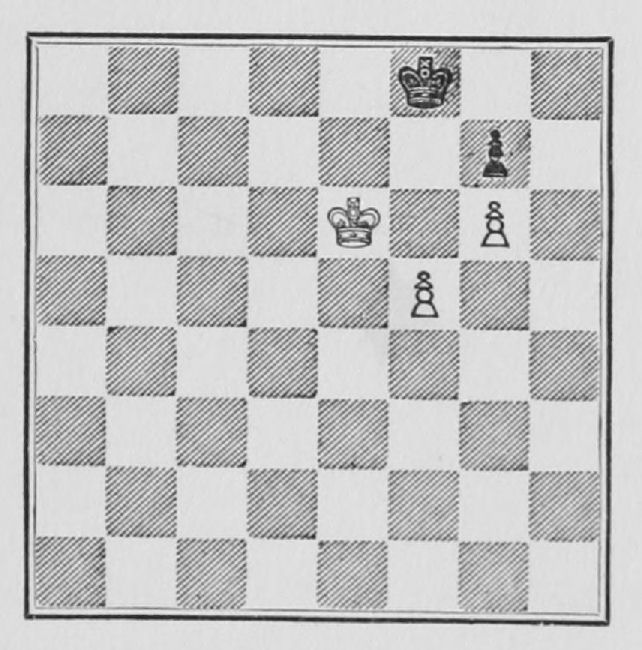 Notice the remarkable position of the pieces. White cannot move anything without incurring some loss. His best chance would have been to play 29 P - K 6, but that would only have prolonged the game, which is lost in any case.
