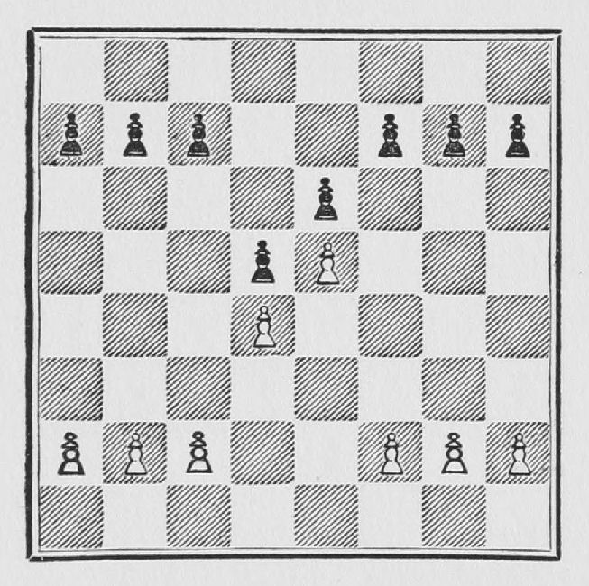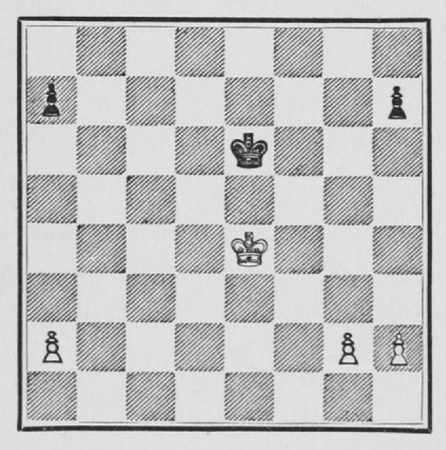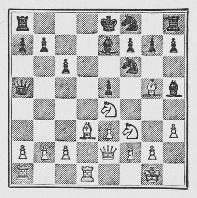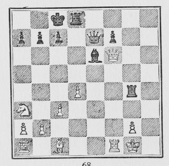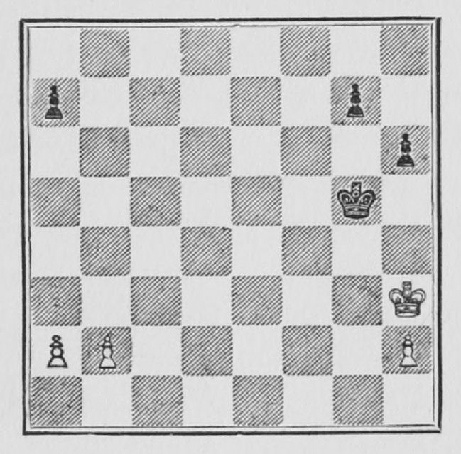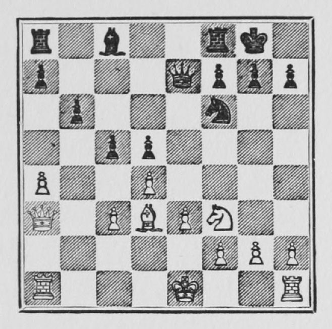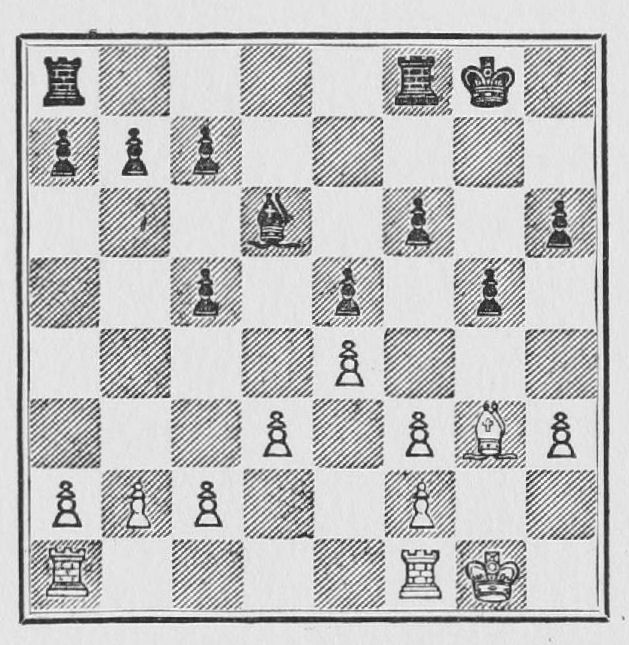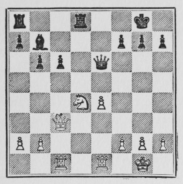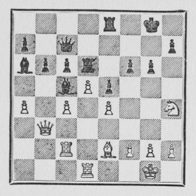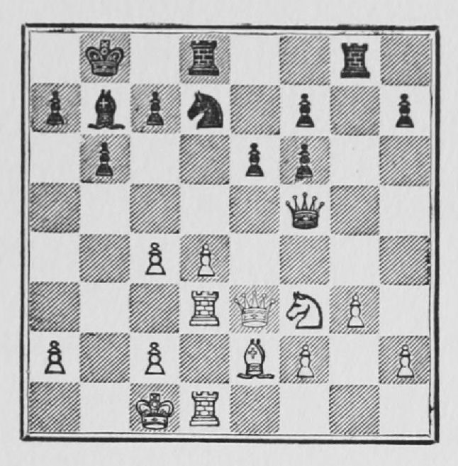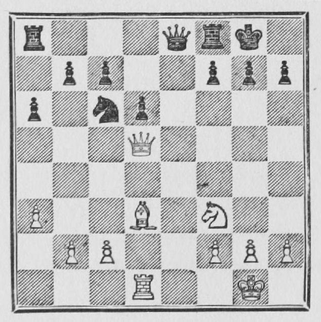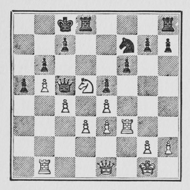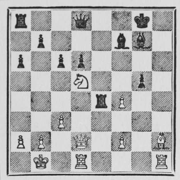 Notice the remarkable position of the pieces. White cannot move anything without incurring some loss. His best chance would have been to play 29 P - K 6, but that would only have prolonged the game, which is lost in any case.