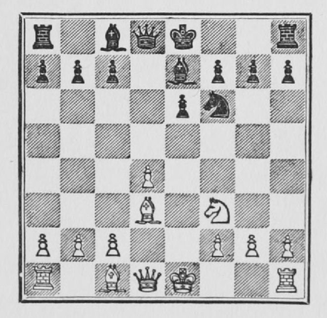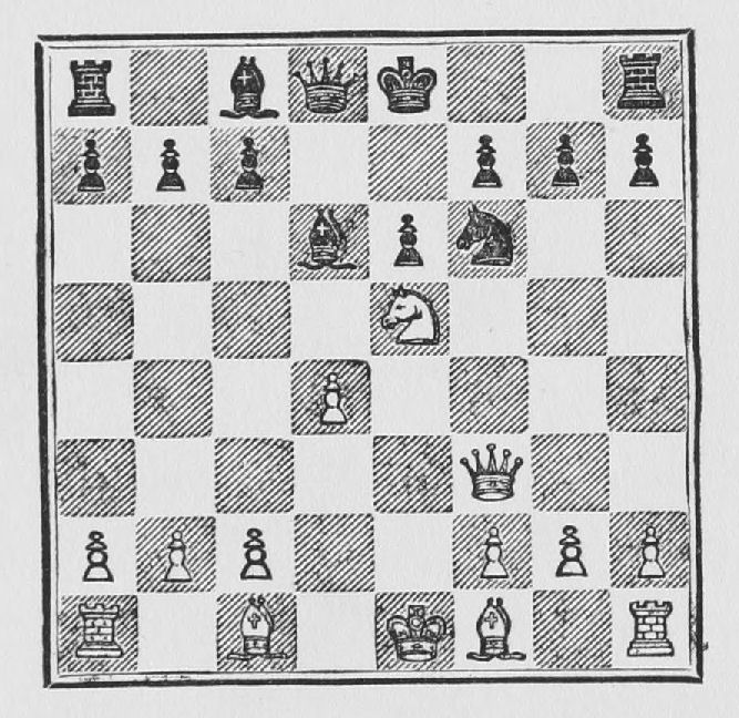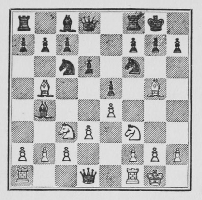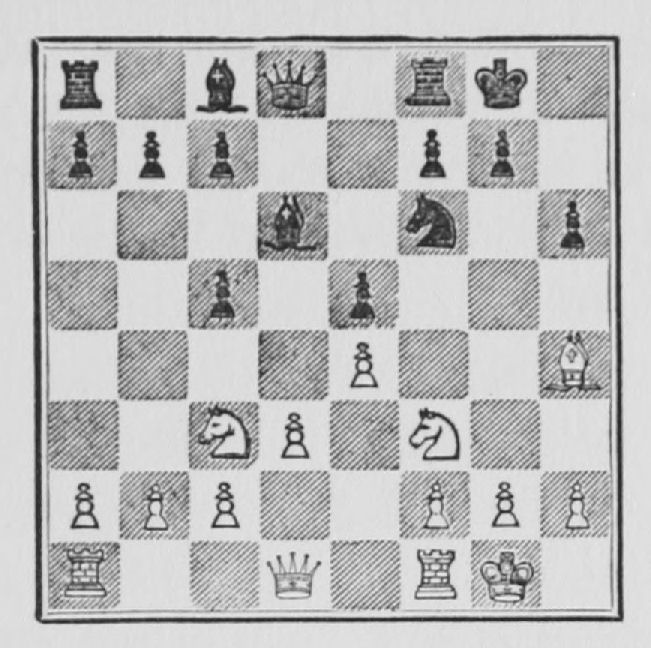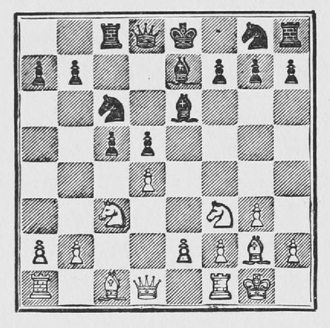 The developing stage can now be said to be complete on both sides. The opening is over and the middle-game begins. White, as is generally the case, has {240}obtained the centre. Black, on the other hand, is entrenched in his first three ranks, and if given time will post his Q R at Q B 1 and his Knight at K B 3, and finally play P - Q B 4, in order to break up White's centre and give full action to the Black Bishop posted at Q Kt 2. In this game White attempts to anticipate that plan by initiating an advance on the centre, which, when carefully analysed, is truly an attack against Black's K P.