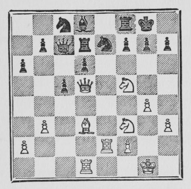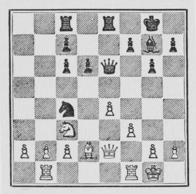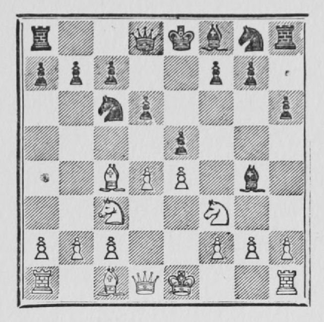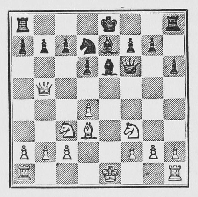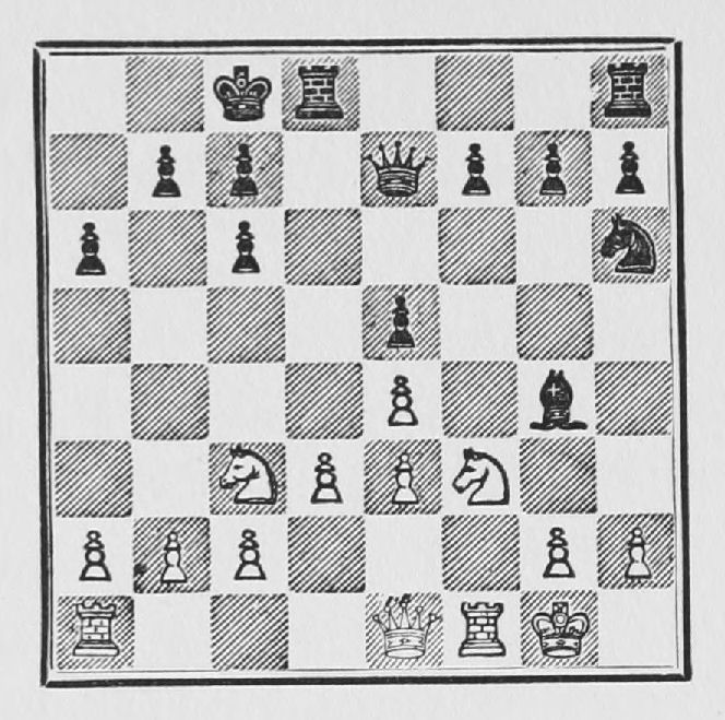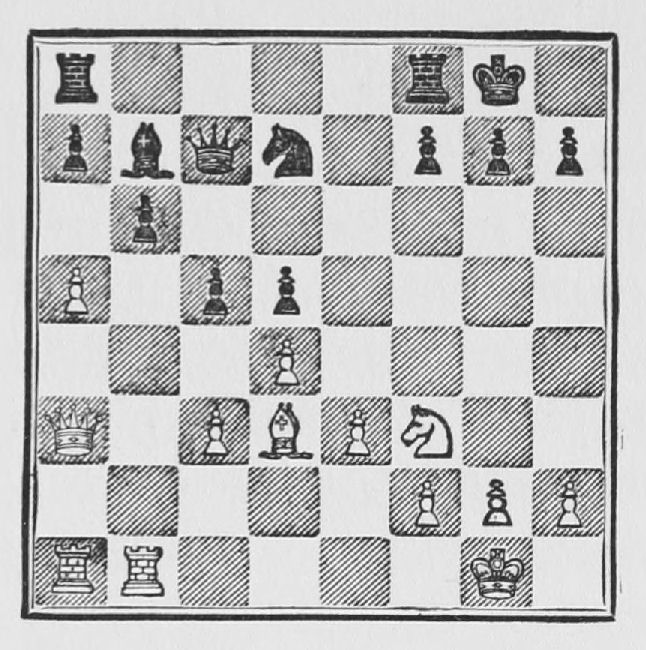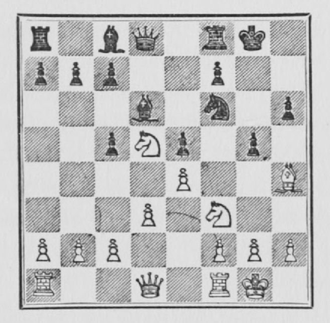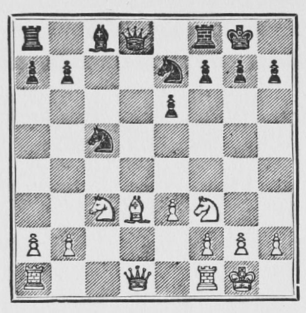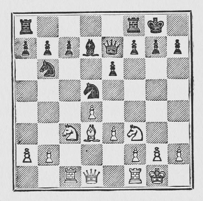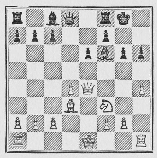Against Kostic in a previous game I had played Kt - B 1. It was carelessness on my part, but Marshall believed differently, otherwise he would not have played this variation, since, had he analysed this move, he would, I think, have realised that Black would obtain an excellent game. Black now threatens not only B P × P; but also Kt × P; followed by B P × P. The position is very interesting and full of possibilities.