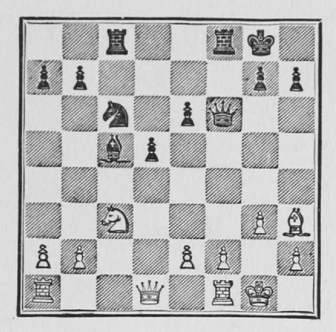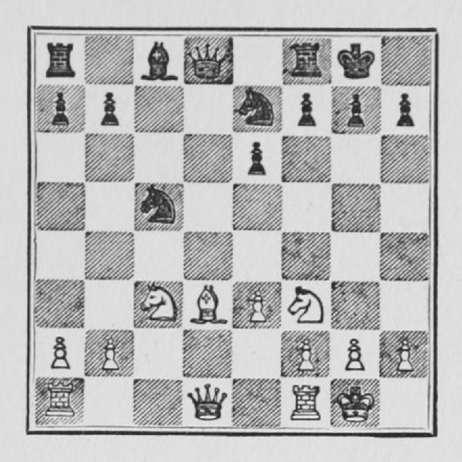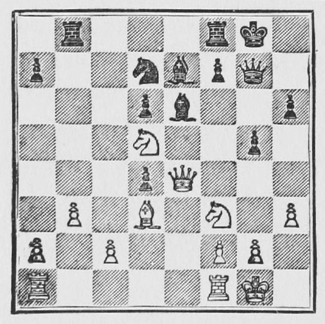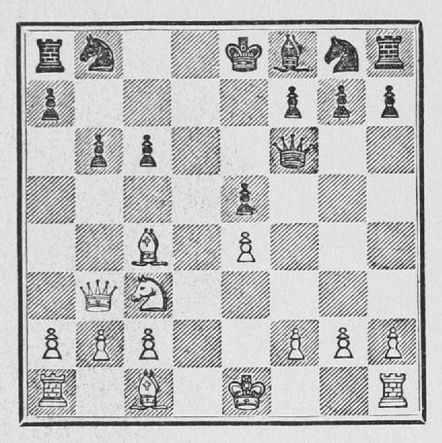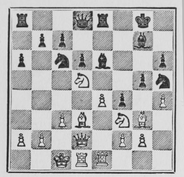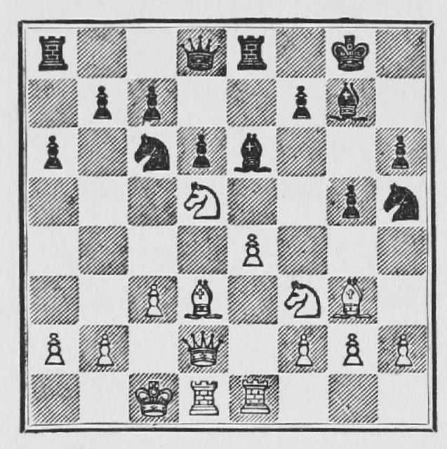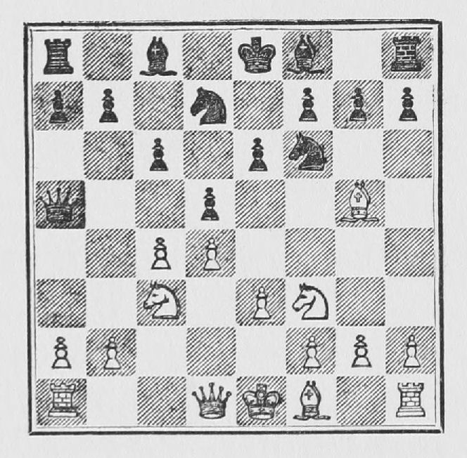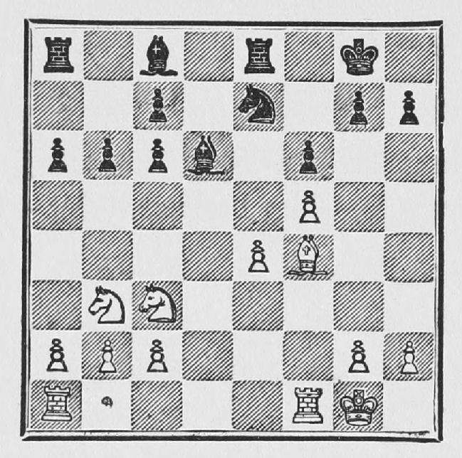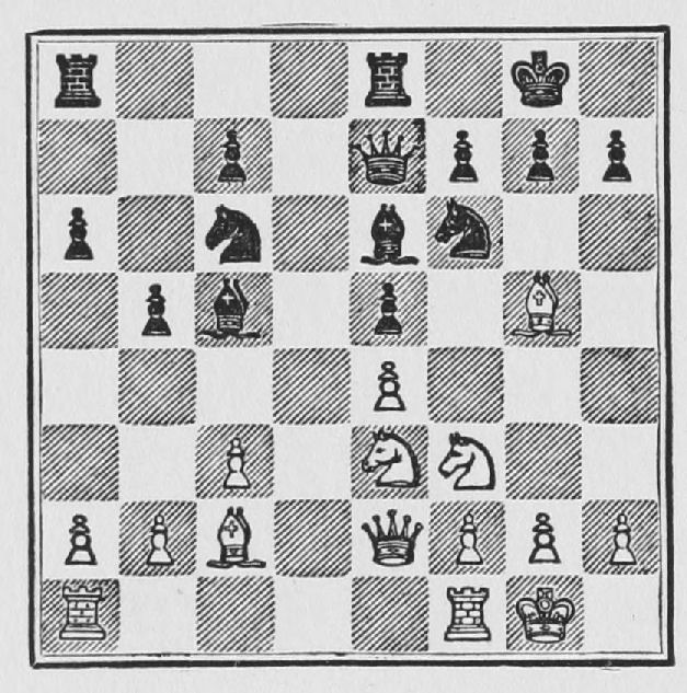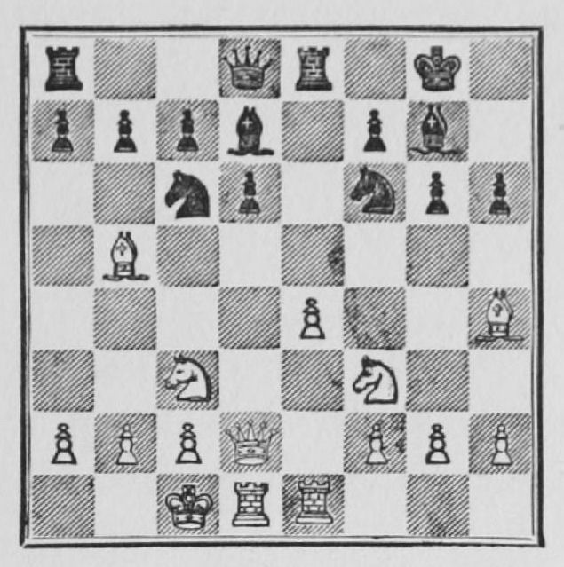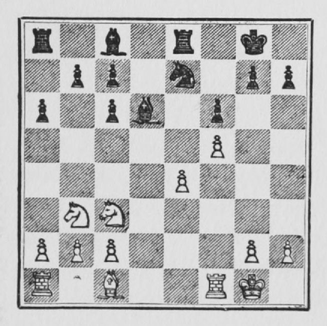 Against Kostic in a previous game I had played Kt - B 1. It was carelessness on my part, but Marshall believed differently, otherwise he would not have played this variation, since, had he analysed this move, he would, I think, have realised that Black would obtain an excellent game. Black now threatens not only B P × P; but also Kt × P; followed by B P × P. The position is very interesting and full of possibilities.