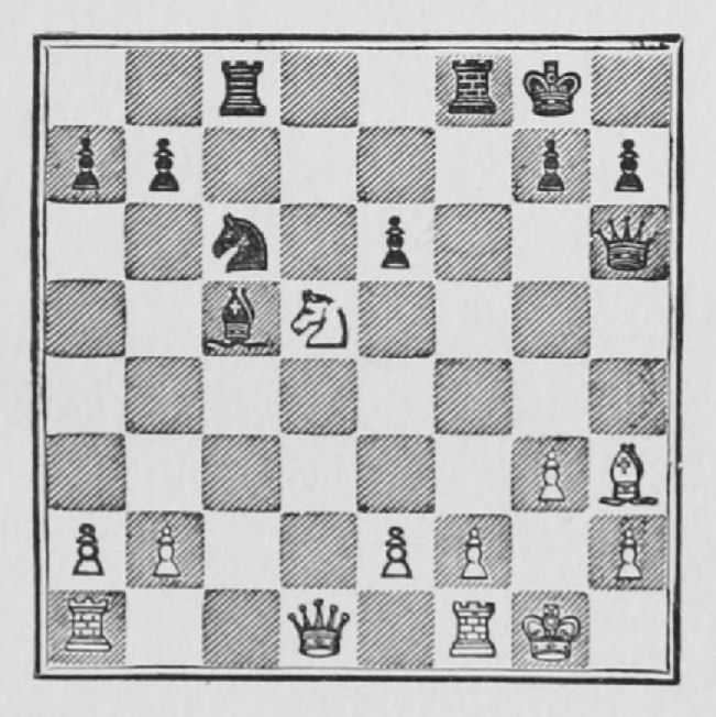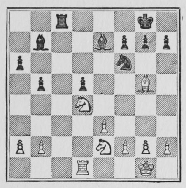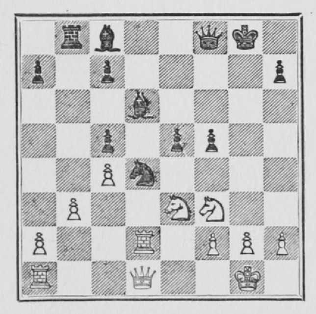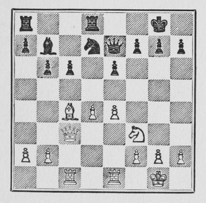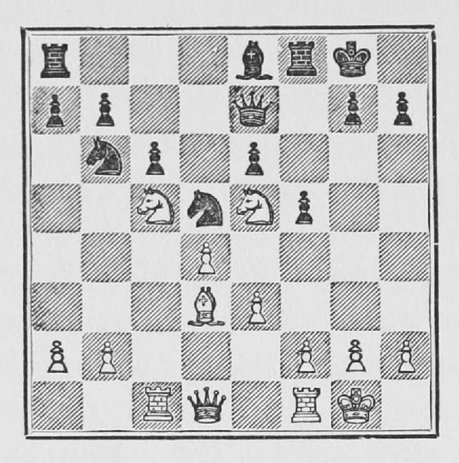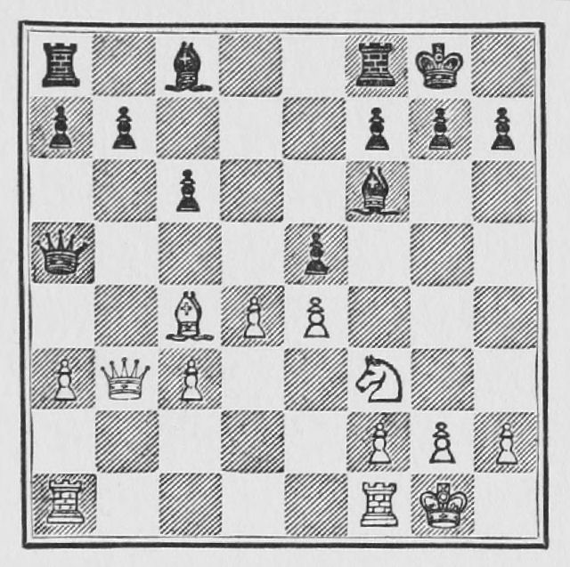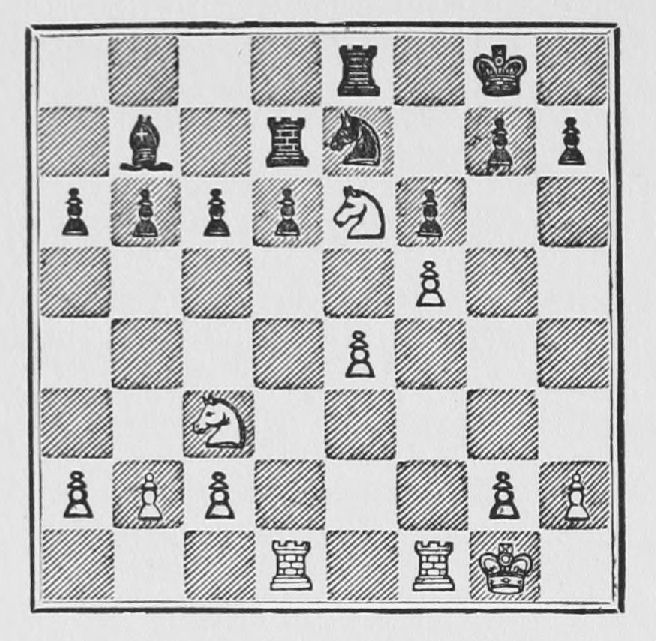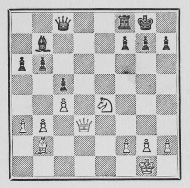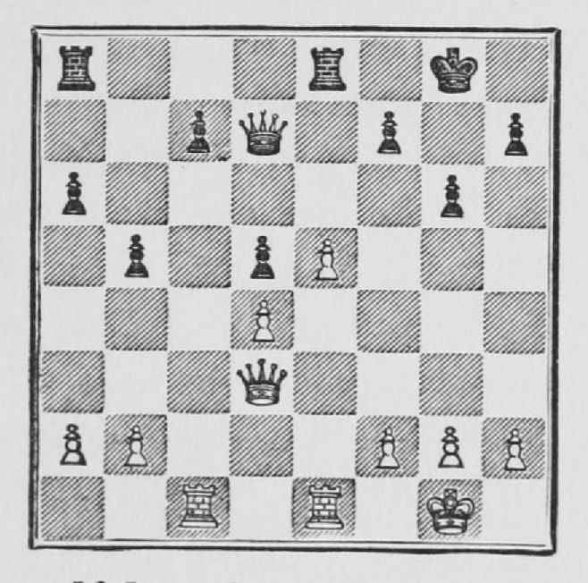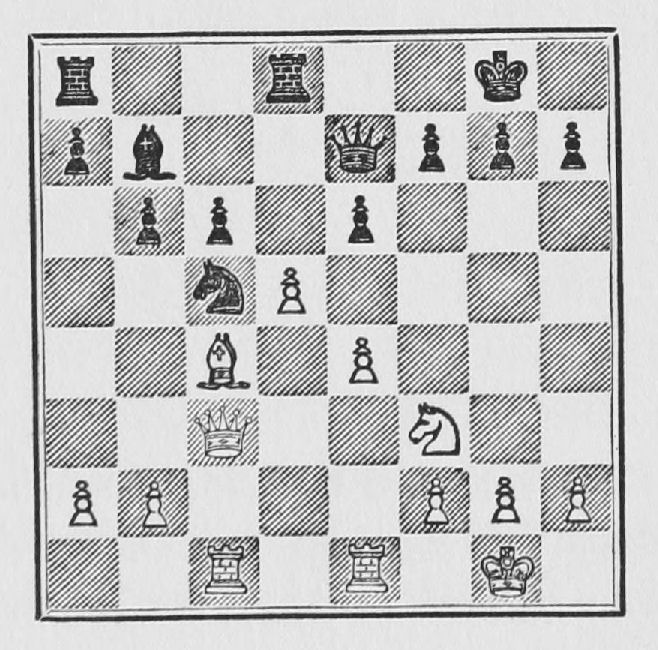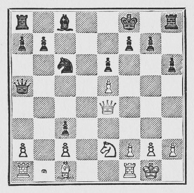 Now that the White Bishop has been driven back, Black wants to get rid of White's strongly posted Knight at Q 5, which blocks the attack of the Bishop at B 2. It may be said that the Knight at Q 5 is the key to White's defence.