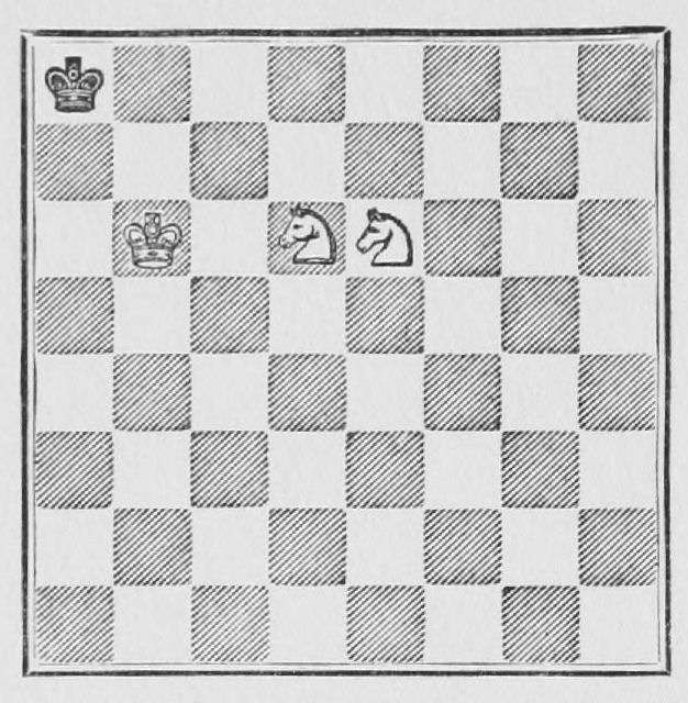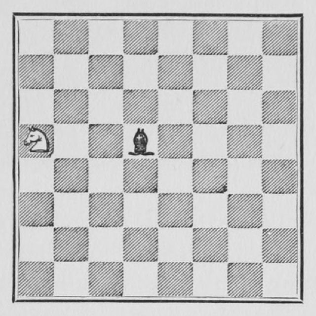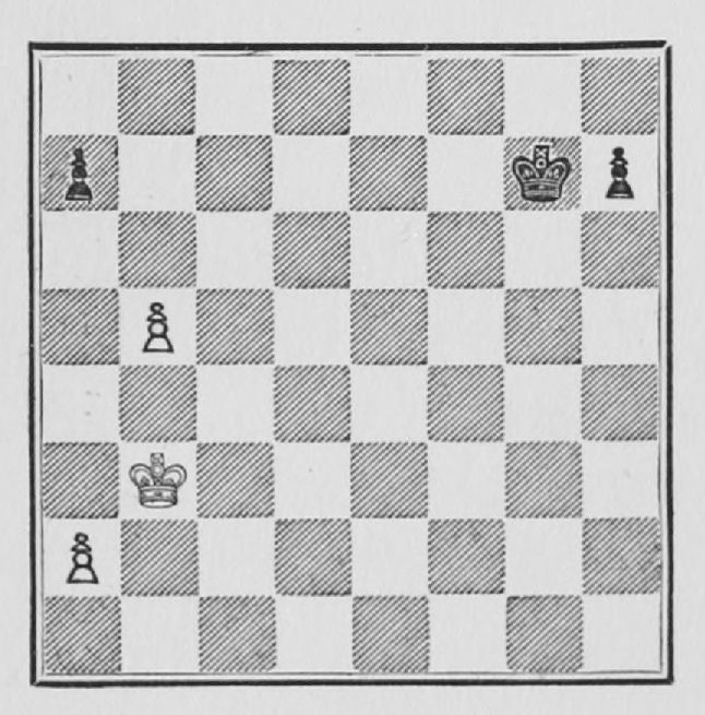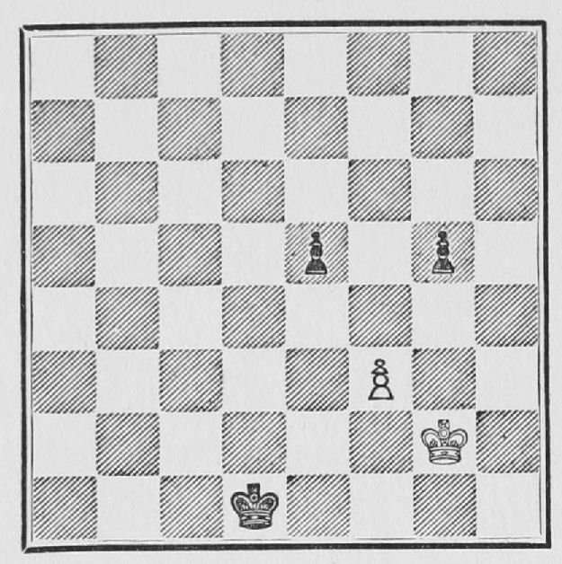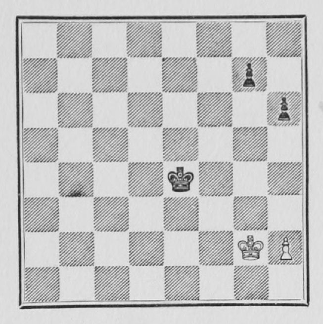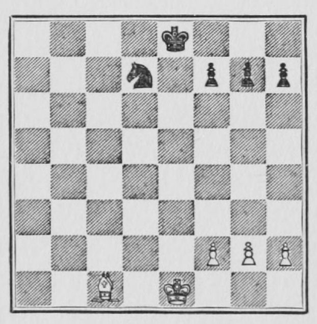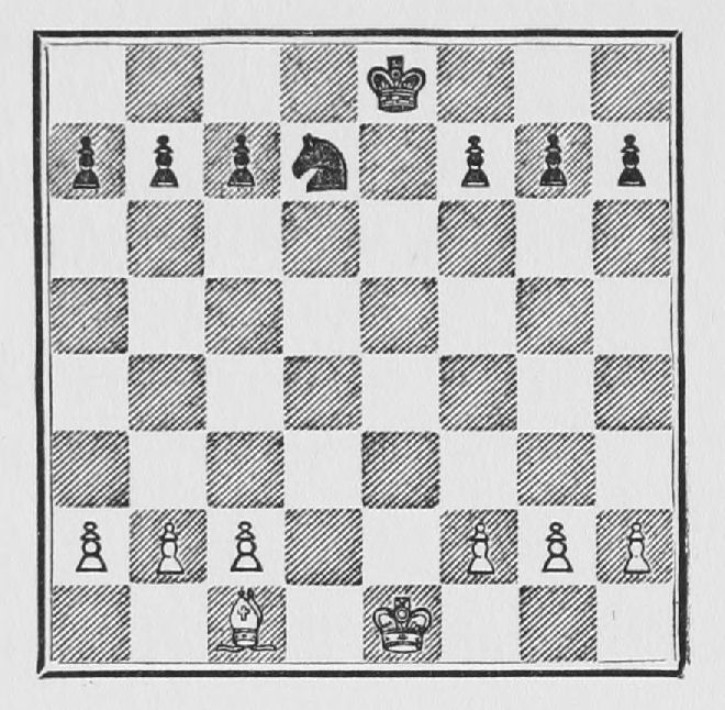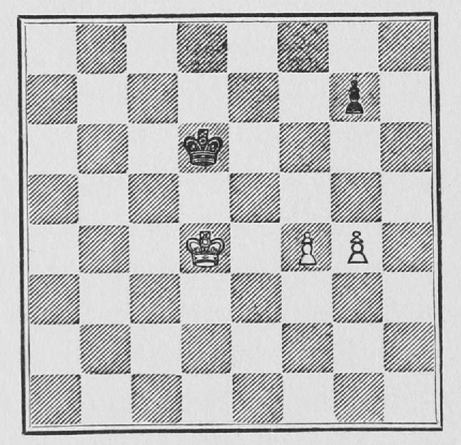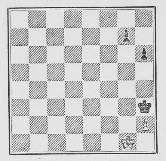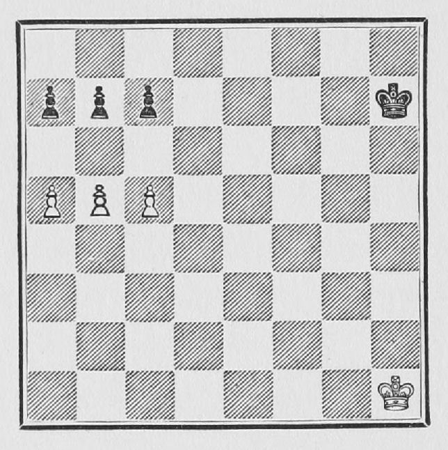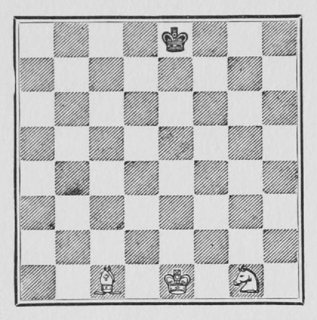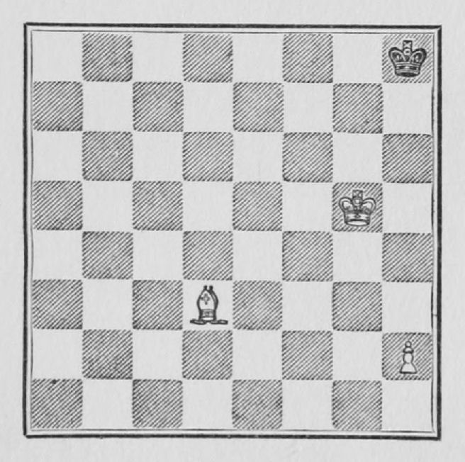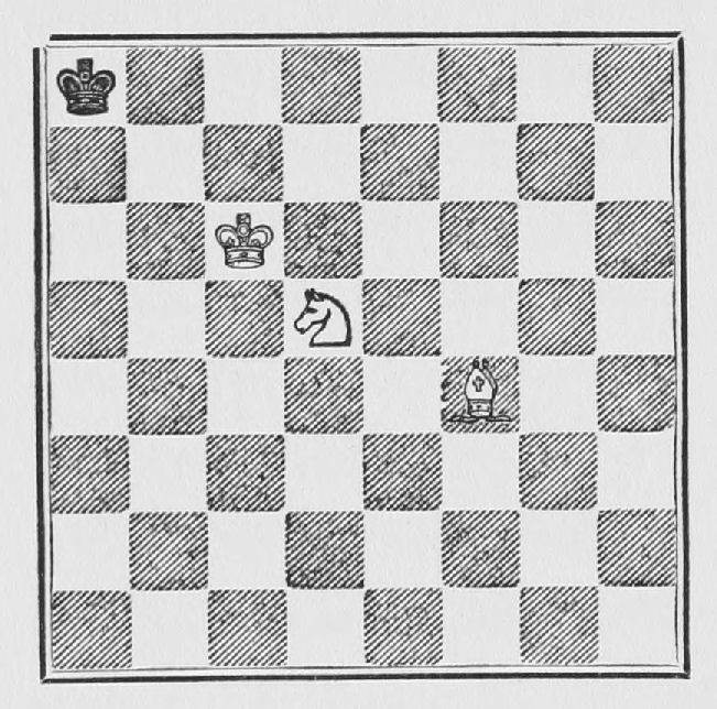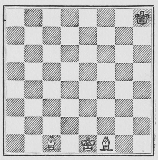 Since the Black King is in the corner, White can play 1 B - Q 3, K - Kt 2; 2 B - K Kt 5, K - B 2; 3 B - B 5, and already the Black King is confined to a few squares. If the Black King, in the original position, had been in the centre of the board, or away from the last row, White should have advanced his King, and then, with the aid of his Bishops, restricted {7}the Black King's movements to as few squares as possible.