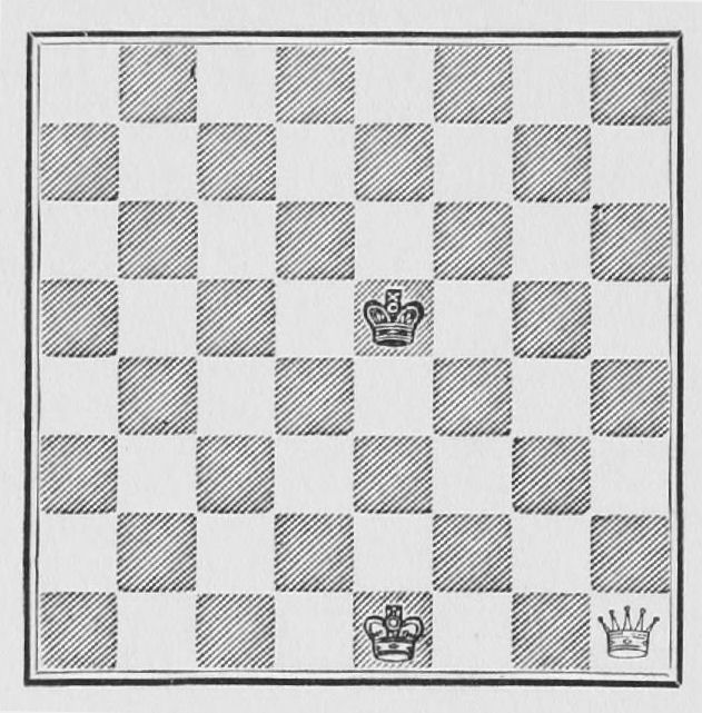 Example 4.—We now come to Queen and King against King. As the Queen combines the power of the Rook and the Bishop, it is the easiest mate of all and should always be accomplished in under ten moves. Take the following position: