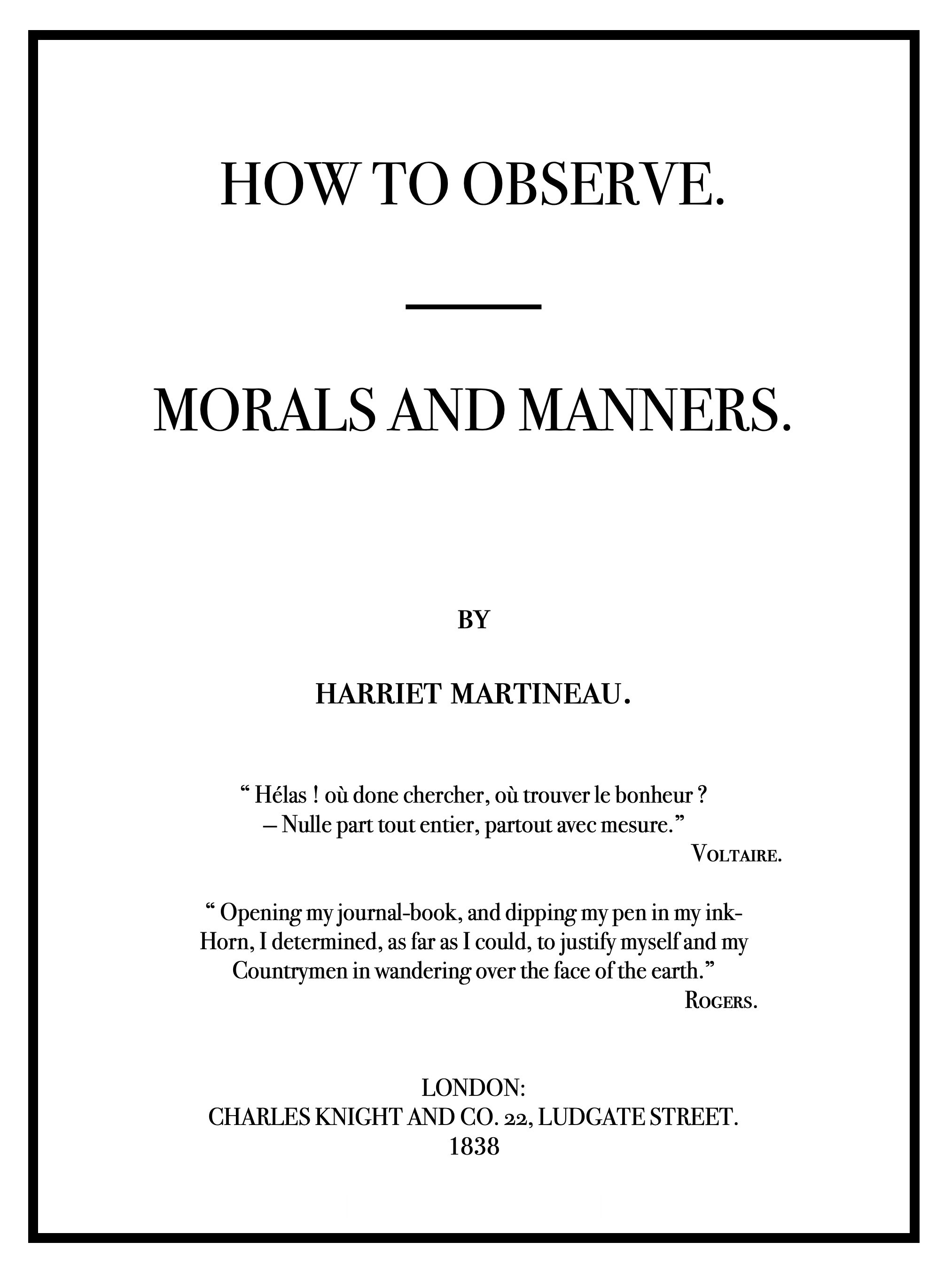 There are two parties to the work of observation on Morals and Manners—the observer and the observed. This is an important fact which the traveller seldom dwells upon as he ought; yet a moment's consideration shows that the mind of the observer—the instrument by which the work is done, is as essential as the material to be wrought. If the instrument be in bad order, it will furnish a bad product, be the material what it may. In this chapter I shall point out what requisites the traveller ought to make sure that he is possessed of before he undertakes to offer observations on the Morals and Manners of a people.