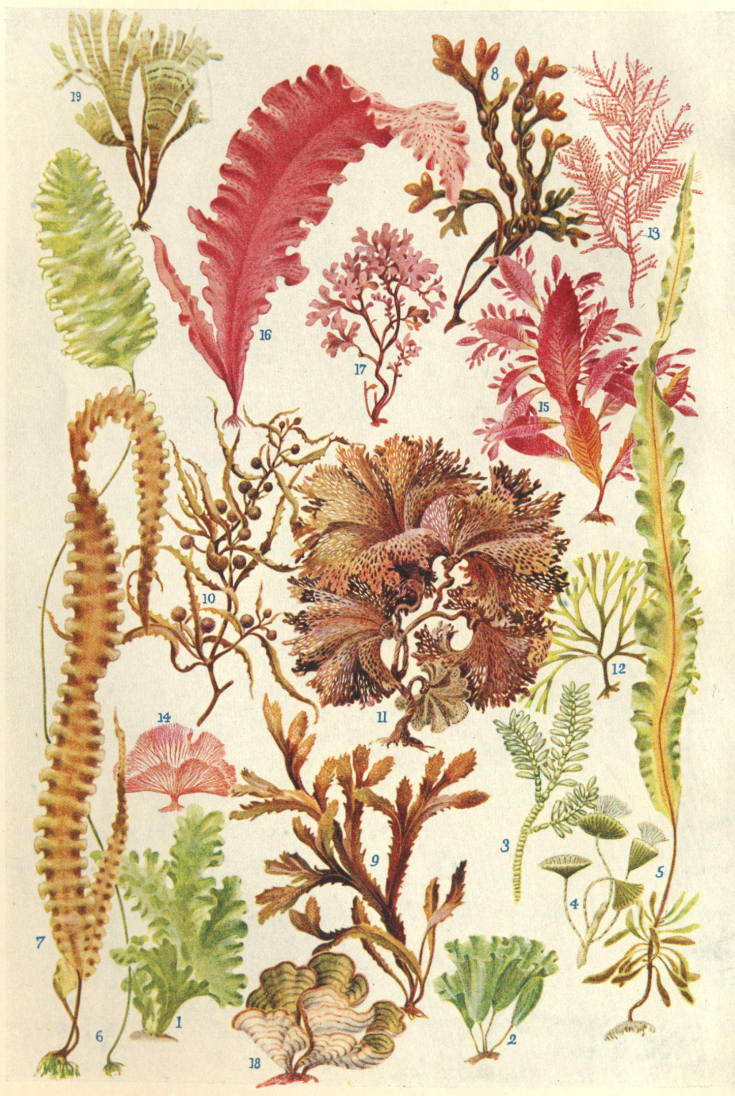 1, The very broad Ulva. 2, Cornucopia. 3, Caulerpa Cactoides. 4, Acetabularia Mediterranea. 5, Bladder-locks. 6, Long-stalked Laminaria. 7, Sugared Laminaria. 8, Bladder Wrack. 9, Serrated Wrack. 10, Gulf-weed. 11, Thalassiophyllum Clathrus. 12, Forked Dictyota. 13, Medicinal Coralline. 14, Corallina Rubens. 15, Delesseria Lyalii. 16, Nitophyllum Crosieri. 17, Membrane-leaved Phyllophira. 18, Peacock's-tail Padina. 19, Banded Taonia.