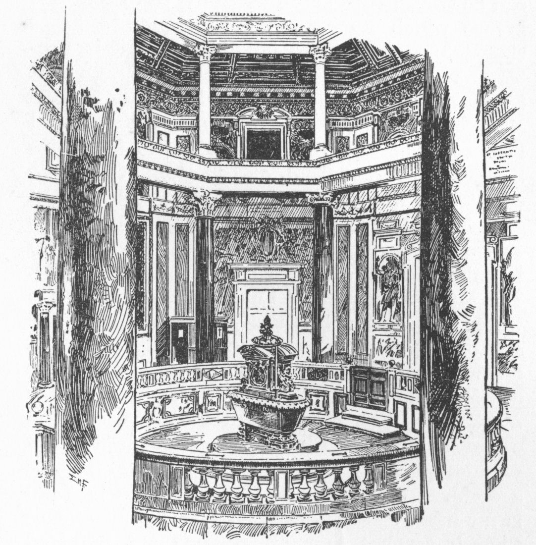 A´trium, the entrance-hall and most important apartment of a Roman house, generally ornamented with statues, pictures, and imagines or ancestral likenesses, which were portrait masks in wax kept in cases. The atrium formed the reception-room for visitors and clients. It was lighted by the compluvium, an opening in the roof, towards which the roof sloped so as to throw the rainwater into a cistern in the floor called the impluvium.