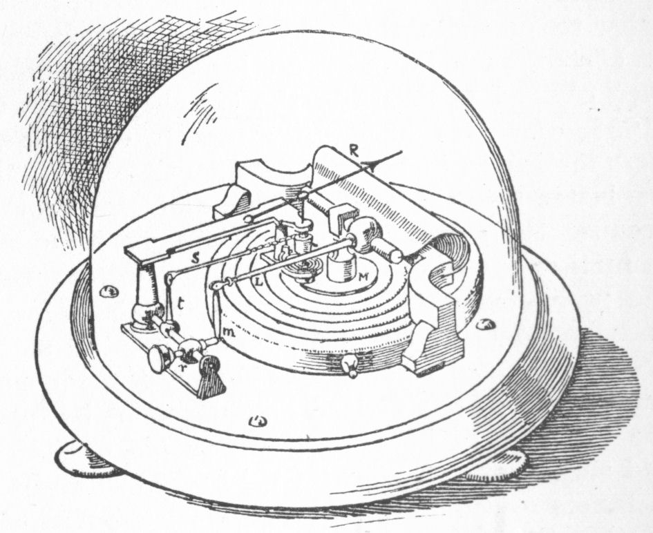 Attwood, George, F.R.S., an English mathematician, born 1746, died 1807, best known by his invention, called after him Attwood's Machine, for verifying the laws of falling bodies. It consists essentially of a freely-moving pulley over which runs a fine cord with two equal weights suspended from the ends. A small additional weight is laid upon one of them, causing it to descend with uniform acceleration. Means are provided by which the added weight can be removed at any point of the descent, thus [307]allowing the motion to continue from this point onward with uniform velocity. See Gravitation.