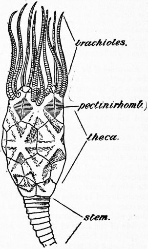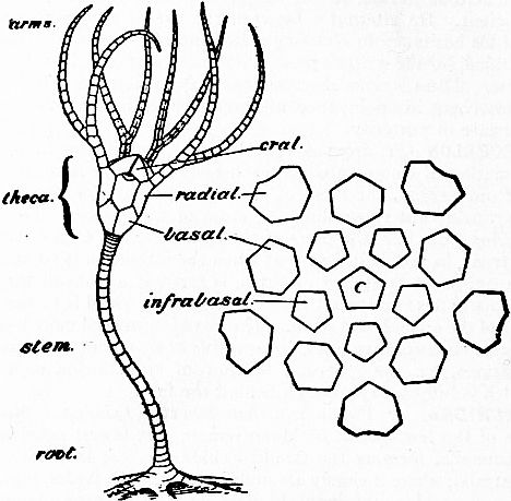 The word “Pelmatozoa” literally means “stalked animals,” but the name is now used to denote all Cystidea, Blastoidea, Crinoidea and Edrioasteroidea, as opposed to the other classes, which may be called Eleutherozoa. Many Pelmatozoa have, it is true, no stalk, while some are freely-moving, but all agree in the possession of certain characters obviously connected with a fixed mode of life. Thus, the mouth is central and turned away from the sea-floor; the animal does not seize its food by tentacles, limbs or jaws, neither does it move in search of it, but a series of ciliated grooves which radiate from the mouth sweep along currents of water, in the eddies of which minute food-particles are caught up and carried down into the gullet; the undigested food is driven out through an anus which is on the upper or oral side of the theca, but as far distant as practicable from the mouth and ciliated grooves. Such characters are found in any primitive, sedentary group. More peculiarly Echinoderm features, in which the Pelmatozoan nature is manifest, are the enclosing of the viscera in a calcified and plated theca, for protection against those enemies from which a fixed animal cannot flee; the development, at the aboral pole of this theca, of a motor nerve-centre giving off branches to the stroma connecting the various plates of the theca and of its brachial, anal, and columnar extensions, and thus co-ordinating the movements of the whole skeleton; the absence of suckers from the podia, which, when present, are respiratory, not locomotor, in function. There are other features of most, if not all, Pelmatozoa that appear to be due to a fixed existence; but those are also found in the Eleutherozoa. The Pelmatozoic theory thus regards the Pelmatozoa as the more ancestral forms, and the Pelmatozoan stage as one that must have been passed through by all Echinoderms during their evolution from the Dipleurula. It might be possible to prove the origin of all classes from Pelmatozoa, without thereby explaining the origin of such fundamental features as radial symmetry, the developmental metamorphosis, and the torsion that affects both gut and body-cavities during that process; but the acceptance of a Dipleurula as the common ancestor necessitates an explanation of these features. Such explanation is an integral part of the Pelmatozoic theory, but is provided by no other.