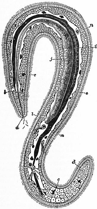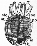 T, The five interradial tentacles. M, The water-pore, leading by the stone-canal stc to the water-ring, from which hangs a Polian vesicle pb. oc, Supposed otocysts. m, Longitudinal muscles. sk, Calcareous spicules. st, Stomach. (After Semon.) |