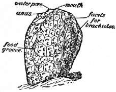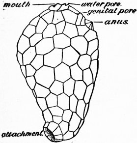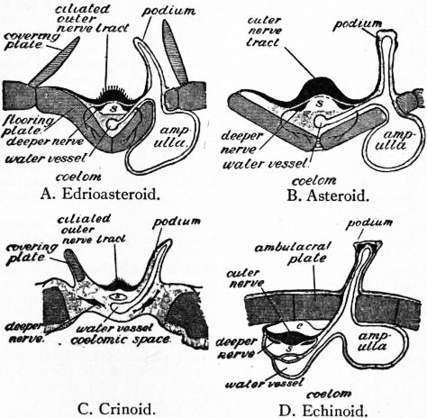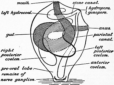 Evolution of the Echinoderms.—It is reasonable to suppose that the Coelomata—animals in which the body-cavity is divided into a gut passing from mouth to anus and a hollow (coelom) surrounding it—were derived from the simpler Coelentera, in which the primitive body-cavity (archenteron) is not so divided, and has only one aperture serving as both mouth and anus. We may, with Sedgwick, suppose the coelom to have originated by the enlargement and separation of pouches that pressed outwards from the archenteron into the thickened body-wall (such structures as the genital pouches of some Coelentera, not yet shut off from the rest of the cavity), and they would probably have been four in number and radially disposed about the central cavity. The evolution of this cavity into a gut is foreshadowed in some Coelentera by the elliptical shape of the aperture, and by the development at its ends of a ciliated channel along which food is swept; we have only to suppose the approximation of the sides of the ellipse and their eventual fusion, to complete the transformation of the radially symmetrical Coelenterate into a bilaterally symmetrical Coelomate with mouth and anus at opposite ends of the long axis. We further suppose that of the four coelomic pouches one was in front of the mouth, one behind the anus, and one on each side. Such an animal, if it ever existed, probably lived near the surface of the sea, and even here it may have changed its medusoid mode of locomotion for one in the direction of its mouth. Thus the bilateral symmetry would have been accentuated, and the organism shaped more definitely into three segments, namely (1) a preoral segment or lobe, containing the anterior coelomic cavity; (2) a middle segment, containing the gut, and the two middle coelomic cavities; (3) a posterior segment, containing the posterior coelomic cavity, which, however, owing to the backward prolongation of the anus, became divided into two—a right and left posterior coelom. Each of these cavities presumably excreted waste products to the exterior by a pore. There was probably a nervous area, with a tuft of cilia, at the anterior end; while, at all events in forms that remained pelagic, the ciliated nervous tracts of the rest of the body may be supposed to have become arranged in bands around the body-segments. Such a form as this is roughly represented to-day by the Actinotrocha larva of Phoronis, the importance of which has been brought out by Masterman. But only slight modifications are required to produce the Tornaria larva of the Enteropneusta and other larvae, including the special type that is inferred from the Dipleurula larval stages of recent forms to have characterized the ancestor of the Echinoderms. We cannot enter here into all the details of comparison between these larval forms; amid much that is hypothetical a few homologies are widely accepted, and the preceding account will show the kind of relation that the Echinoderms bear to other animals, including what are now usually regarded as the ancestors of the Chordata (to which back-boned animals belong), as well as the nature of the evidence that their study has been, or may be, made to yield. How the hypothetical Dipleurula became an Echinoderm, and how the primitive Echinoderms diverged in structure so as to form the various classes, are questions to which an answer is attempted in the following paragraphs:—