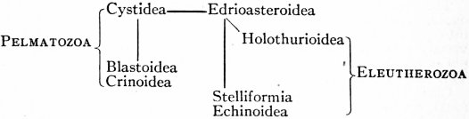 The classes of the Eleutherozoa probably arose independently from different branches of the Pelmatozoan stem. The precise relation is not clear, but the order in which they are here placed is believed to be from the more primitive to the more specialized.
