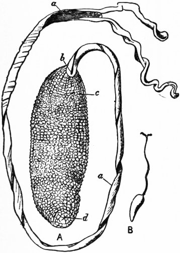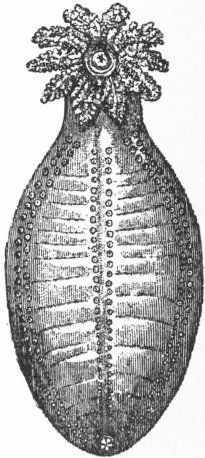 | Fig. 15.—An Aspidochirote Holothurian of the family Holothuriidae, showing the mouth surrounded by tentacles, the anus at the other end of the body, and three of the rows of podia. |