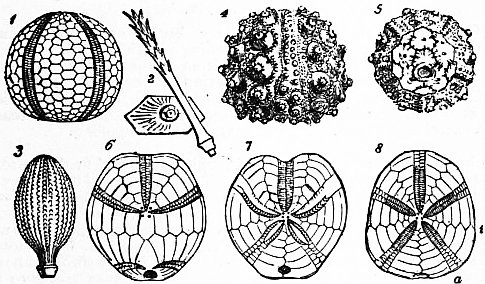 The evidence for the Pelmatozoic theory is supplied by palaeontology, embryology, the comparative anatomy of the classes, and a consideration of other phyla. Palaeontology, so far as it goes, is a sure guide, but some of the oldest fossiliferous rocks yield remains of distinctly differentiated crinoids, asteroids and echinoids, so that the problem is not solved merely by collecting fossils. Two lines of argument appear fruitful. First, a comparison of the relative numbers of the representatives of the various classes at different epochs; according to this they may be placed in the following order, with the oldest first: Cystidea, Crinoidea, Blastoidea, Asteroidea, Ophiuroidea, Echinoidea. As for Holothuroidea, the fossil evidence allows us to say no more than that the class existed in early Carboniferous times, if not before. The second method is to work out by slow and sure steps the lines of descent of the different families, orders, and classes, and so either to arrive at the ancestral form of each class, or to plot out the curve of evolution, which may then legitimately be projected into “the dark backward and abysm of time.” In this way the many highly modified orders of Cystidea may be traced back to a simple, many-plated ancestor with little or no radiate symmetry (see below). All the complicated structures of Blastoidea are evolved from a fairly simple type, which in its turn is linked on to one of the cystid orders. That the crinoids are all deducible from some such simple form as that above described under the head “calycinal theory,” is now generally admitted. Although, in the extreme correlation of the radial food-grooves, nerves, water-vessels, and so forth, with a radiate symmetry of the theca, such a type differs from the Cystidea, while in the possession of jointed processes from the radial plates, bearing the grooves and the various body-systems outwards from the theca, it differs from all other Echinoderms, nevertheless ancient forms are known which, if they are not themselves the actual links, suggest how the crinoid type may have been evolved from some of the more regular cystids. The fourth class of Pelmatozoa—the Edrioasteroidea—differs from the others in the structure of its ambulacra. As in all Pelmatozoa these seem to have borne ciliated food-grooves protected by movable covering-plates (fig. 11). Beneath each food-groove was a radial water-vessel and probably a nerve and blood-vessel, all which structures passed either between certain regularly arranged thecal plates, or along a furrow floored by those plates, which were then in two alternating series. The important and distinctive feature is the presence of pores between the flooring-plates, on either side of the groove; and these, we cannot doubt, served for the passage of podia. Thus in a highly developed edrioasteroid, such as Edrioaster itself (fig. 11), there was a true ambulacrum, apparently constructed like that of a starfish, but differing in the possession of a ciliated food-groove protected by covering-plates. The simpler forms of Edrioasteroidea, with their more sac-like body and undifferentiated plates, may well have been derived from early Cystidea of yet simpler structure, and there seems no reason to follow Jaekel in regarding the class as itself the more primitive. Turning to fossil Asteroidea, we find the earlier ophiurids scarcely distinguishable from the asterids, while in the alternation of the ambulacrals, which undoubtedly correspond to the flooring-plates of Edrioaster, both groups approach the Pelmatozoan type. These facts have been expressed by Sturtz in his names Encrinasteriae and Ophio-encrinasteriae. There is no difficulty in deducing the highly differentiated asterids and ophiurids of a later day from these simpler types. The evolution of the modern Echinoidea from their Palaeozoic ancestors is also well understood, but in this case the ancestral form to which the palaeontologist is led does not at first sight present many resemblances to the Pelmatozoa. It is, however, characterized by simplicity of structure, and a short description of it will serve to clear the problem from unnecessary difficulties. Bothriocidaris (fig. 5), a small echinoid from the Ordovician rocks of Esthonia, is in essential structure just the form demanded by comparative palaeontology to make a starting-point. It is spheroidal, with the mouth and anus at opposite poles; there are five ambulacra, and the ambulacral plates are large, simple and alternating, each being pierced by two podial pores which lie in a small oval depression; the ambulacrals next the mouth form a closed ring of ten plates; the interambulacrals lie in single columns between the ambulacra, and are separated from the mouth-area by the proximal ambulacrals just mentioned, and sometimes by the second set of ambulacrals also; the ambulacra end in the five oculars or terminals, which meet in a ring around the anal area and have no podial pores, but one of them serves as a madreporite; within this ring is a star-shaped area filled with minute irregular plates, none of which can safely be selected as the homologues of the so-called basals or genitals of later forms; within the ring of ambulacrals around the mouth are five somewhat pointed plates, which Jaekel regards as teeth, but which can scarcely be homologous with the interradially placed teeth of later echinoids, since they are radial in position; small spines are present, especially around the podial pores. The position of the pores near the centre of the ambulacrals in Bothriocidaris need not be regarded as primitive, since other early Palaeozoic genera, not to mention the young of living forms, show that the podia originally passed out between the plates, and were only gradually surrounded by their substance; thus the original structure of the echinoid ambulacra differed from that of the early asteroid in the position of the radial vessels and nerves, which here lie beneath t