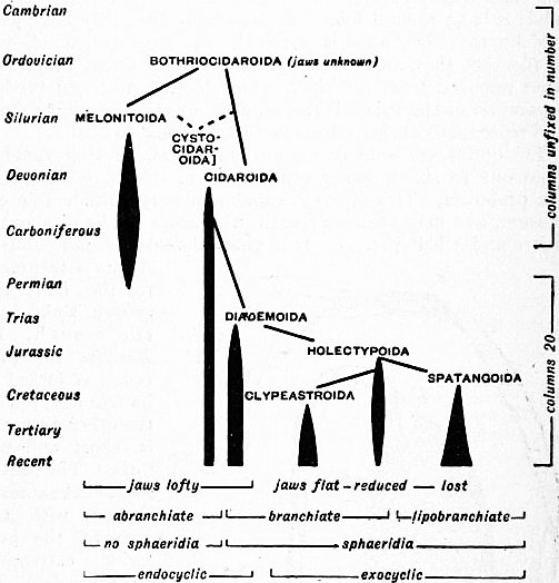 The vast mass of material made known by these and many other distinguished writers has to be included in our classification, and that classification itself must be controlled by the story it reveals. Thus it is that a change, characteristic of modern systematic zoology, is affecting the subdivisions of the classes. It is not long since the main lines of division corresponded roughly to gaps in geological history: the orders were Palaeocrinoidea and Neocrinoidea, Palechinoidea and Euechinoidea, Palaeasteroidea and Euasteroidea, and so forth. Or divisions were based upon certain modifications of structure which, as we now see, affected assemblages of diverse affinity: thus both Blastoidea and Euechinoidea were divided into Regularia and Irregularia; the Holothuroidea into Pneumophora and Apneumona; and Crinoids were discussed under the heads “stalked” and “unstalked.” The barriers between these groups may be regarded as horizontal planes cutting across the branches of the ascending tree of life at levels determined chiefly by our ignorance; as knowledge increases, and as the conception of a genealogical classification gains acceptance, they are being replaced by vertical partitions which separate branch from branch. The changes may be appreciated by comparing the systematic synopses at the end of this article with the classification adopted in 1877 in the 9th edition of the Ency. Brit. (vol. vii.), or in any zoological text-book contemporary therewith. In the present stage of our knowledge these minor divisions are the really important ones. For, whereas to one brilliant suggestion of far-reaching homology another can always be opposed, by the detailed comparison of individual growth-stages in carefully selected series of fossils, and by the minute application to these of the principle that individual history repeats race history, it actually is possible to unfold lines of descent that do not admit of doubt. The gradual linking up of these will manifest the true genealogy of each class, and reconstruct its ancestral forms by proof instead of conjecture. The problem of the interrelations of the classes will thus be reduced to its simplest terms, and even questions as to the nature of the primitive Echinoderm and its affinity to the ancestors of other phyla may become more than exercises for the ingenuity of youth. Work has been and is being done by the laborious methods here alluded to, and though the diversity of opinion as to the broader groupings of classification is still restricted only by the number of writers, we can point to an ever-increasing body of assured knowledge on which all are agreed. Unfortunately such allusion to these disconnected certainties as alone might be introduced here would be too brief for comprehension, and we are forced to select a few of the broader hypotheses for a treatment that may seem dogmatic and prejudiced.
