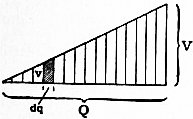 We arbitrarily call the potential of the earth zero, since all potential difference is relative and there is no absolute potential any more than absolute level. We call the difference of potential between a charged conductor and the earth the potential of the conductor. Hence when a body is charged positively its potential is raised above that of the earth, and when negatively it is lowered beneath that of the earth. Potential in a certain sense is to electricity as difference of level is to liquids or difference of temperature to heat. It must be noted, however, that potential is a mere mathematical concept, and has no objective existence like difference of level, nor is it capable per se of producing physical changes in bodies, such as those which are brought about by rise of temperature, apart from any question of difference of temperature. There is, however, this similarity between them. Electricity tends to flow from places of high to places of low potential, water to flow down hill, and heat to move from places of high to places of low temperature. Returning to the case of the charged body with the space around it cut up into electric cells by the tubes of force and shells of potential, it is obvious that the number of these cells is represented by the product QV, where Q is the charge and V the potential of the body in electrostatic units. An electrified conductor is a store of energy, and from the definition of potential it is clear that the work done in increasing the charge q of a conductor whose potential is v by a small amount dq, is vdq, and since this added charge increases in turn the potential, it is easy to prove that the work done in charging a conductor with Q units to a potential V units is ½QV units of work. Accordingly the number of electric cells into which the space round is cut up is equal to twice the energy stored up, or each cell contains half a unit of energy. This harmonizes with the fact that the real seat of the energy of electrification is the dielectric or insulator surrounding the charged conductor.1