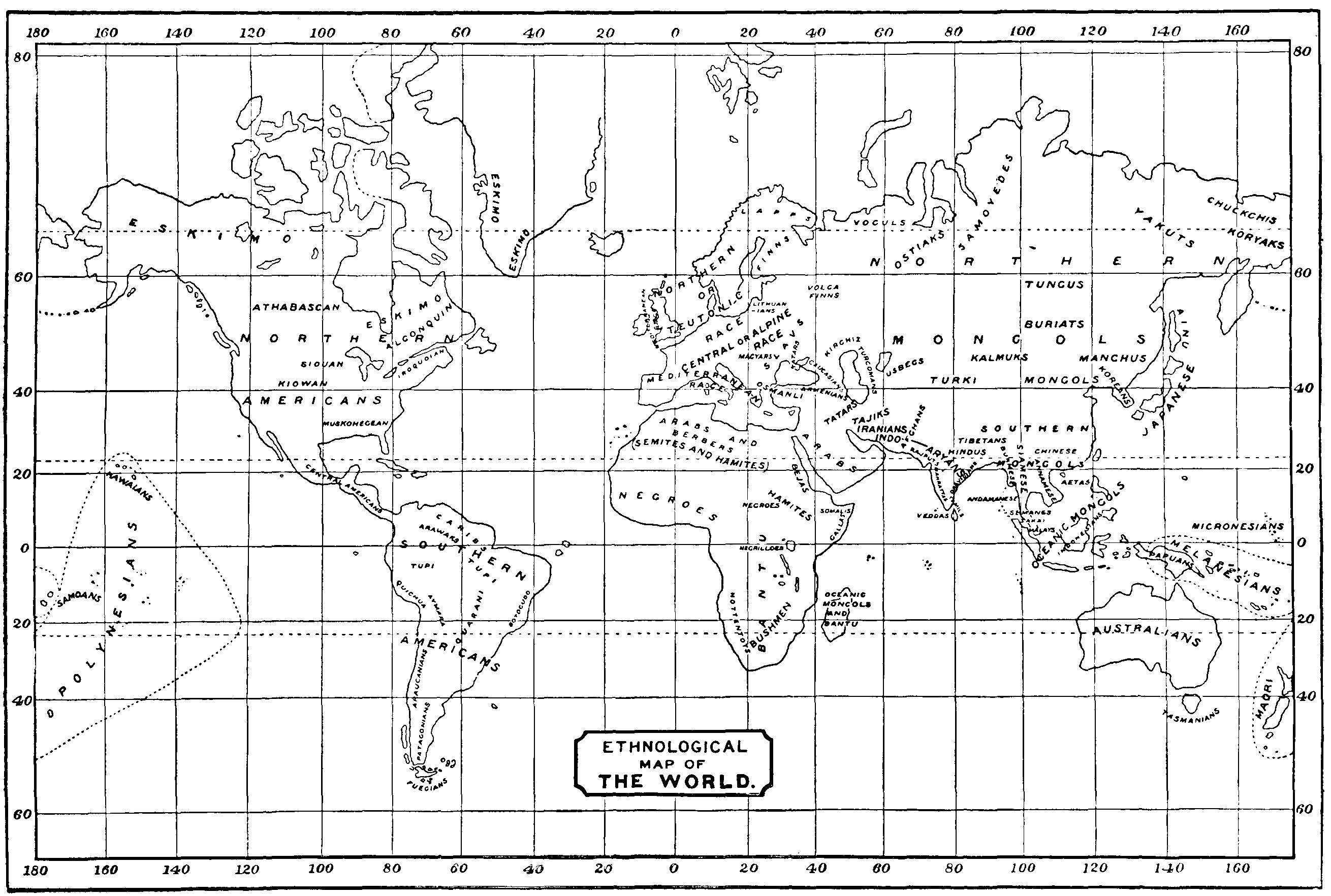 After the ancestors of the Australian and Negro races had separated from the rest of mankind, which had spread throughout a great part of Asia, North-Eastern Africa, and Europe, the coming of the Glacial epoch created barriers of ice which shut up the various groups each within its own domain. Somewhere in Eastern Asia, possibly in the basin of the Yellow River, the proto-Mongolian race gradually assumed its characteristic traits. In East Africa and the neighbouring tract of Asia the ancestors of the Brown or so-called Mediterranean race were free to roam east and west from India to the African and European coasts of the Atlantic. Farther north, probably in Europe, the Nordic or Blond race (in the map labelled Northern or Teutonic race) assumed its distinctive features; and somewhere in the region between its area of characterization and that of the Yellow race—probably in the region to the north-east of the Caspian—the so-called Alpine (Armenoid) [306]or proto-Slav race developed. It is distinguished from the Brown and Blond races by the broad skull and heavy jaw, no less than by the robustness of build and the great tendency to hairiness; from the Mongolian people the Armenoids are distinguished by the prominence of the nose, the character of the hair, and the colour of the skin. The term Alpine, which is usually applied to this race, is singularly inappropriate; for, although in Europe and Asia Minor the members of this race show a partiality for high mountains, the vast majority of the members of the race dwell in the plains of Russia, which also may have been the original home of the race. In view of the topographical relationship of the area of characterization of this race to the homes of the other races, Nordic, Brown, Negro, Australian, and Mongol, arranged in a great arc around it, it might not be inappropriate to call the so-called Alpine (Armenoid or proto-Slav) race by the non-committal title 'Central'. At the close of the Glacial epoch, when the melting of the ice unlocked the domains of these races, members of the Central race poured into Asia Minor and Syria, and down to the head of the Persian Gulf; they also made their way north of the Caspian and Black Sea into Europe, mingling there with the Nordic people. But they also moved east in Siberia and mingled with the proto-Mongolian race. It was soon after this event that members of the proto-Mongolian stock, possibly with some admixture of people of the Central race, wandered to North-Eastern Asia and crossed the Behring Strait to colonize America for the first time. From the north-west coast of America these immigrants in course of time made their way south and east, until eventually the whole of the New World from Hudson Bay to Cape Horn was inhabited. Many centuries afterward (especially between 300 B.C. and A.D. 1000) there was a great influx of a variety of other peoples from Polynesia and the Old World on to the Pacific coast of the Americas, which profoundly altered the physical type of the population of Central America and the Andean coast.