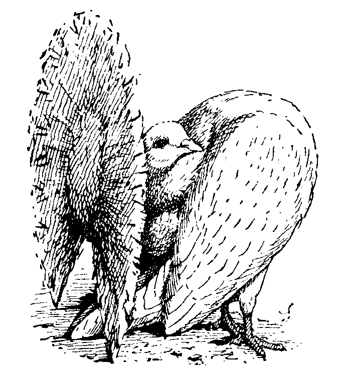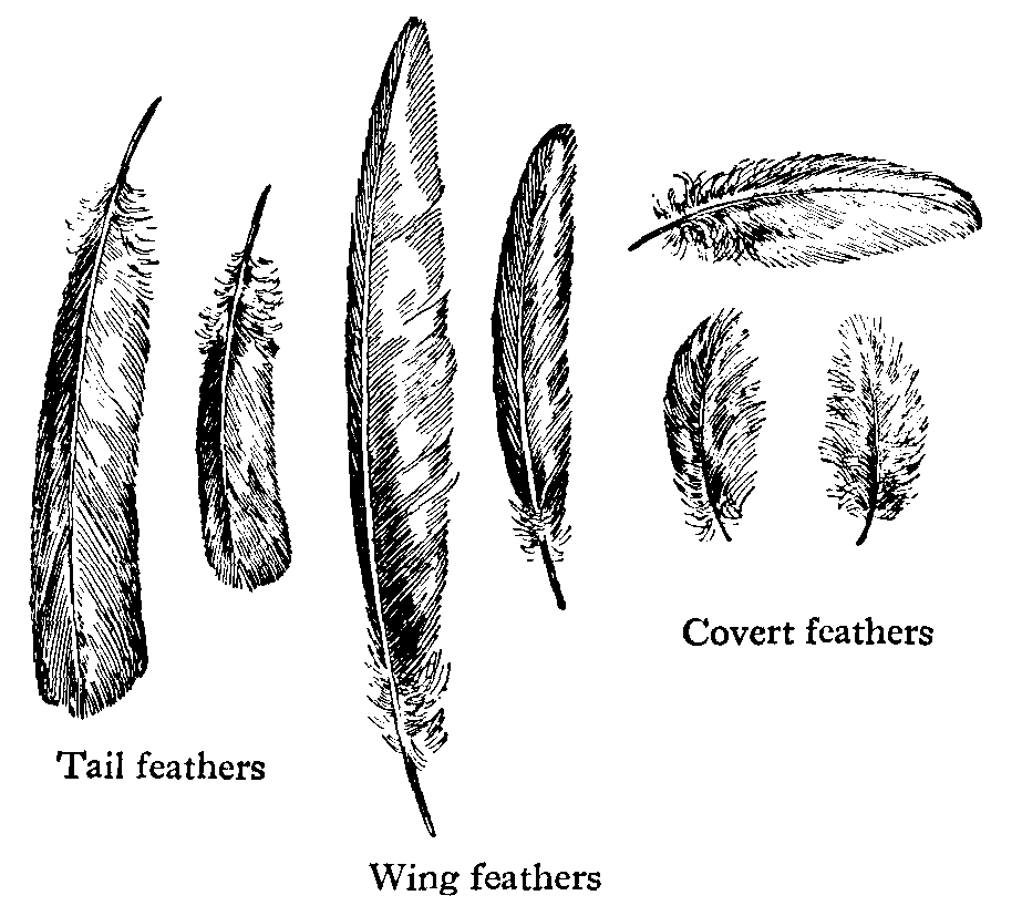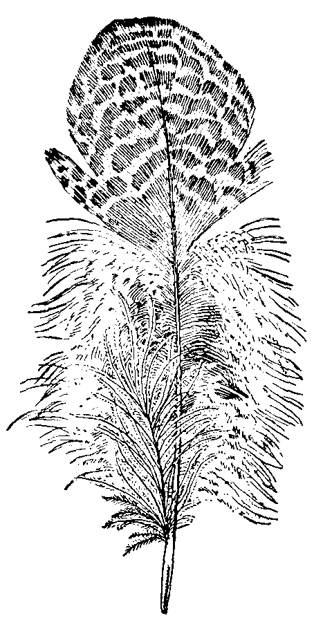 Feathers, the form which the dermal appendages assume in birds, agreeing in mode of development, but differing in form from hairs and scales. The feather consists of a stem, horny, round, strong, and hollow in the lower part, called the quill, and in the upper part, called the shaft, filled with pith. On each side of the shaft is a web composed of a series of regularly arranged fibres called barbs. The barbs and shaft constitute the vane. On the edges of the barbs are set the barbules, which interlock with those of adjacent barbs, and thus give strength to the vane. Feathers are of four chief kinds. (1) Quill feathers of the wing (remiges) and tail (rectrices); the former are attached to the hand and forearm. (2) Contour feathers, which determine the external form and are attached to certain areas of the skin; those overlapping the quills are known as wing-coverts and tail-coverts. (3) Small soft down feathers. (4) Hair-like feathers (filoplumes). The plumage of birds is of characteristic colours, due either to pigments or physical structure (metallic feathers), and commonly having a protective function by harmonizing with the surroundings (especially in females), or, when of bright kind, playing a part in courtship (especially in males). The [445]feathers of birds are periodically changed, generally once, but in some species twice a year. This is called moulting. When feathers have reached their full growth they become dry, and only the tube, or the vascular substance which it contains, continues to absorb moisture or fat. When, therefore, part of a feather is cut off, it does not grow out again; and a bird whose wings have been clipped remains in that condition till the next moulting season, when the old stumps are shed and new feathers grow out. If, however, the stumps are pulled out sooner (by which operation the bird suffers nothing), the feathers will be renewed in a few weeks or even days. The feather is a very strong formation, not readily damaged, the arch of the shaft resisting pressure, while the web and fine fibres yield without suffering. Being a bad conductor of heat, it preserves the high temperature of the bird, while it is so light as to be easily carried in flight. It is rendered almost impervious to wet by the oily fluid which most birds secrete at the base of the tail. Feathers form a considerable article of commerce, particularly those of the ostrich, heron, swan, peacock, and goose, for plumes, ornaments, filling of beds, pens, and other purposes.