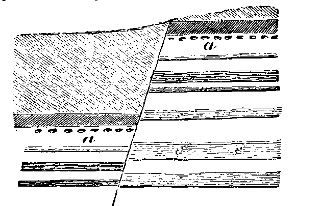 Fault, in geology, a fracture of strata, accompanied by a sliding down or an upheaval of the deposits on the one side of the fracture to a greater distance than the other. Faults are frequently recognizable in coal-beds, the miner coming unexpectedly upon an abrupt wall cutting off the seam. The angle this makes with the plane of the bed he is working usually indicates [443]whether he must look up or down for its continuation on the other side of the fracture; but reversed faults occur, in which the strata on one side have been pushed up the slope of the plane of fracture. In mines these faults often serve for natural drains. The cut shows at a a the change of position in strata caused by a fault. This is called the throw, and is measured vertically.