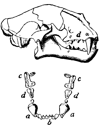Skull and Teeth of the Tiger. a, Canines or tearing teeth. b, Incisors or cutting teeth. c, True molars or grinding teeth. d, Carnassial or sectorial teeth.