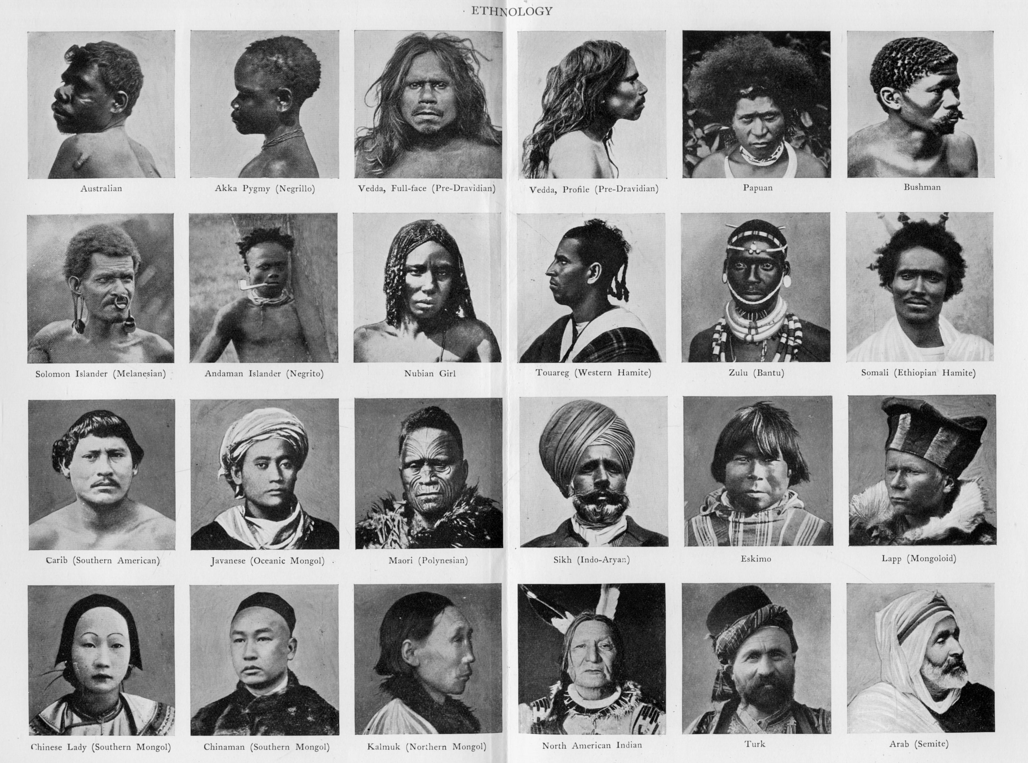 Ethnol´ogy and Ethnog´raphy, sciences dealing with man, the aim of the former being to analyse and interpret the meaning of the social phenomena of mankind, as shown in their customs, languages, institutions, &c., the latter being more concerned with descriptive details and the orderly collection of facts relating to particular tribes and localities. Both terms, however, are used very loosely and in a variety of ways, often being confused with anthropology, the general science or natural history of mankind, of which the other two are parts. Anthropology, again, is sometimes used in the narrower sense implied in the word somatology, the study of the physical structure and distinctive characteristics of the various races of mankind. When the term ethnology is used by the politician or [303]journalist, in most cases it is intended to refer to the racial components in a given territory; in other words, it is used in the sense in which the scientific writer would employ the word anthropology. For instance, when the endeavour was made in the earlier part of the nineteenth century to liberate the Greeks from Turkish dominion, the plea was put forward that they differed in race; and the delimitation of the territory of the Greek state was claimed on what was called 'the ethnological basis', the geographical distribution of people of Greek nationality. Even since then, and especially during the European War and the subsequent attempt at a settlement, claims have been put forward to fix the boundaries of Italy, Yugo-Slavia, Czecho-Slovakia, Poland, &c., on the basis of race and nationality. But further confusion arises from the attempt to apply this anthropological or ethnological test in deciding whether physical type, language, religion, or social traditions and usages are to be the test of nationality. In this article it will be convenient to give the term ethnology its widest meaning, and to consider not merely the customs, beliefs, and institutions of various peoples, but also the early history of the human family, its differentiation into races and the significance of their geographical distribution, and the different phases of culture which are found in the various communities even of the same race.