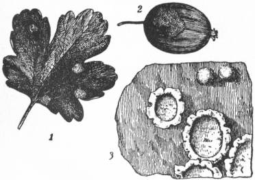 | 1, Leaf showing patches of cluster-cups on surface; 2, Fruit, showing same; 3, Cluster-cups much enlarged. |