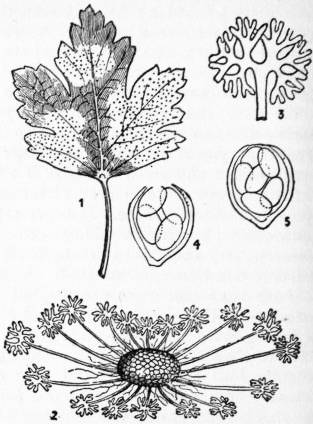 | 1, Leaf attacked by the fungus; 2, Fructification or perithecium; the end of one of its numerous appendages is shown more highly magnified in 3, 4, 5, spore sacs (asci) from the perithecium, containing spores. |