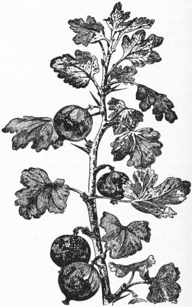 The wild gooseberry is a small, straggling bush, nearly resembling the cultivated plant,—the branches being thickly set with sharp spines, standing out singly or in diverging tufts of two or three from the bases of the short spurs or lateral leaf shoots, on which the bell-shaped flowers are produced, singly or in pairs, from the groups of rounded, deeply-crenated 3- or 5-lobed leaves. The fruit is smaller than in the garden kinds, but is often of good flavour; it is generally hairy, but in one variety smooth, constituting the R. Uva-crispa of writers; the colour is usually green, but plants are occasionally met with having deep purple berries. The gooseberry is indigenous in Europe and western Asia, growing naturally in alpine thickets and rocky woods in the lower country, from France eastward, perhaps as far as the Himalaya. In Britain it is often found in copses and hedgerows and about old ruins, but has been so long a plant of cultivation that it is difficult to decide upon its claim to a place in the native flora of the island. Common as it is now on some of the lower slopes of the Alps of Piedmont and Savoy, it is uncertain whether the Romans were acquainted with the gooseberry, though it may possibly be alluded to in a vague passage of Pliny: the hot summers of Italy, in ancient times as at present, would be unfavourable to its cultivation. Abundant in Germany and France, it does not appear to have been much grown there in the middle ages, though the wild fruit was held in some esteem medicinally for the cooling properties of its acid juice in fevers; while the old English name, Fea-berry, still surviving in some provincial dialects, indicates that it was similarly valued in Britain, where it was planted in gardens at a comparatively early period. William Turner describes the gooseberry in his Herball, written about the middle of the 16th century, and a few years later it is mentioned in one of Thomas Tusser’s quaint rhymes as an ordinary object of garden culture. Improved varieties were probably first raised by the skilful gardeners of Holland, whose name for the fruit, Kruisbezie, may have been easily corrupted into the present English vernacular word.1 Towards the end of the 18th century the gooseberry became a favourite object of cottage-horticulture, especially in Lancashire, where the working cotton-spinners have raised numerous varieties from seed, their efforts having been chiefly directed to increasing the size of the fruit. Of the many hundred sorts enumerated in recent horticultural works, few perhaps equal in flavour some of the older denizens of the fruit-garden, such as the “old rough red” and “hairy amber.” The climate of the British Islands seems peculiarly adapted to bring the gooseberry to perfection, and it may be grown successfully even in the most northern parts of Scotland; indeed, the flavour of the fruit is said to improve with increasing latitude. In Norway even, the bush flourishes in gardens on the west coast nearly up to the Arctic circle, and it is found wild as far north as 63°. The dry summers of the French and German plains are less suited to it, though it is grown in some hilly districts with tolerable success. The gooseberry in the south of England will grow well in cool situations, and may be sometimes seen in gardens near London flourishing under the partial shade of apple trees; but in the north it needs full exposure to the sun to bring the fruit to perfection. It will succeed in almost any soil, but prefers a rich loam or black alluvium, and, though naturally a plant of rather dry places, will do well in moist land, if drained.