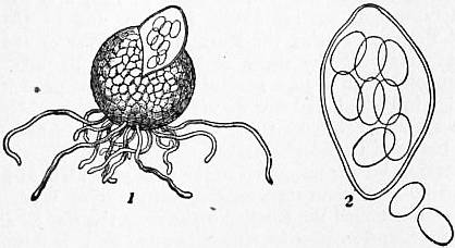 | Fig. 3B.—1, Fructification (perithecium) bursting, ascus containing spores protruding; 2, Ascus with spores more highly magnified. |