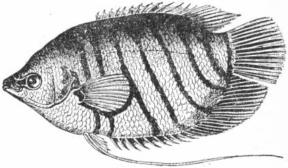 GORAMY, or Gouramy (Osphromenus olfax), reputed to be one of the best-flavoured freshwater fishes in the East Indian archipelago. Its original home is Java, Sumatra, Borneo and several other East Indian islands, but thence it has been transported to and acclimatized in Penang, Malacca, Mauritius and even Cayenne. Being an almost omnivorous fish and tenacious of life, it seems to recommend itself particularly for acclimatization in other tropical countries; and specimens kept in captivity become as tame as carps. It attains the size of a large turbot. Its shape is flat and short, the body covered with large scales; the dorsal and anal fins are provided with numerous spines, and the ventral fins produced into long filaments. Like Anabas, the climbing perch, it possesses a suprabranchial accessory respiratory organ.