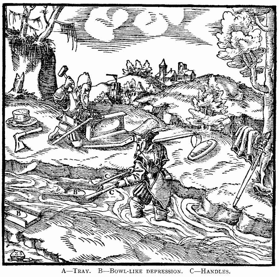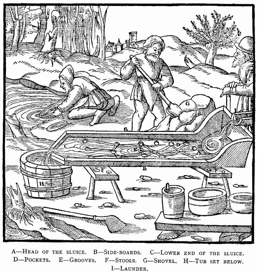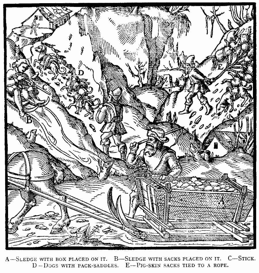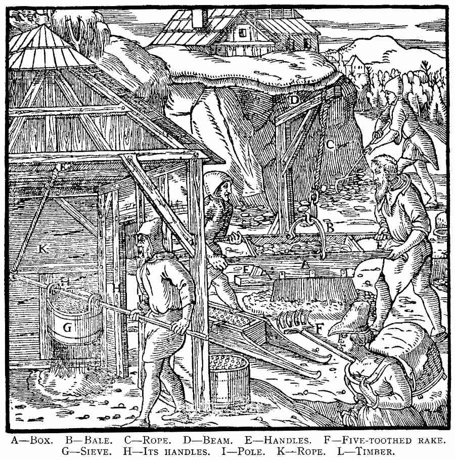 In 1526 Agricola returned to Zwickau, and in 1527 he was chosen town physician at Joachimsthal. This little city in Bohemia is located on the eastern slope of the Erzgebirge, in the midst of the then most prolific metal-mining district of Central Europe. Thence to Freiberg is but fifty miles, and the same radius from that city would include most of the mining towns so frequently mentioned in De Re Metallica—Schneeberg, Geyer, Annaberg and Altenberg—and not far away were Marienberg, Gottesgab, and Platten. Joachimsthal was a booming mining camp, founded but eleven years before Agricola's arrival, and already having several thousand inhabitants. According to Agricola's own statement[4], he spent all the time not required for his medical duties in visiting the mines and smelters, in reading up in the Greek and Latin authors all references to mining, and in association with the most learned among the mining folk. Among these was one Lorenz Berman, whom Agricola afterward set up as the "learned miner" in his dialogue Bermannus. This book was first published by Froben at Basel in 1530, and was a sort of catechism on mineralogy, mining terms, and mining lore. The book was apparently first submitted to the great Erasmus, and the publication arranged by him, a warm letter of approval by him appearing at the beginning of the book[5]. In 1533 he published De Mensuris et Ponderibus, through Froben, this being a discussion of Roman and Greek weights and measures. At about this time he began De Re Metallica—not to be published for twenty-five years.