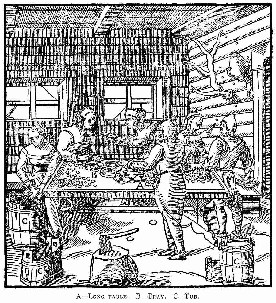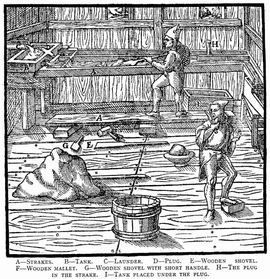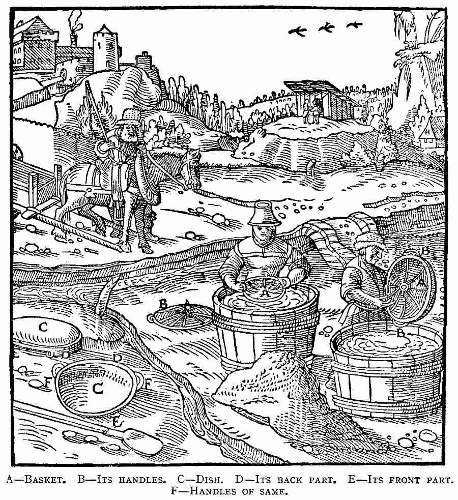 So far as we know, De Re Metallica was never actually published in other than Latin, German, and Italian. However, a portion of the accounts of the firm of Froben were published in 1881[24], and therein is an entry under March, 1560, of a sum to one Leodigaris Grymaldo for some other work, and also for "correction of Agricola's De Re Metallica in French." This may of course, be an error for the Italian edition, which appeared a little later. There is also mention[25] that a manuscript of De Re Metallica in Spanish was [Pg xvii]seen in the library of the town of Bejar. An interesting note appears in the glossary given by Sir John Pettus in his translation of Lazarus Erckern's work on assaying. He says[26] "but I cannot enlarge my observations upon any more words, because the printer calls for what I did write of a metallick dictionary, after I first proposed the printing of Erckern, but intending within the compass of a year to publish Georgius Agricola, De Re Metallica (being fully translated) in English, and also to add a dictionary to it, I shall reserve my remaining essays (if what I have done hitherto be approved) till then, and so I proceed in the dictionary." The translation was never published and extensive inquiry in various libraries and among the family of Pettus has failed to yield any trace of the manuscript.