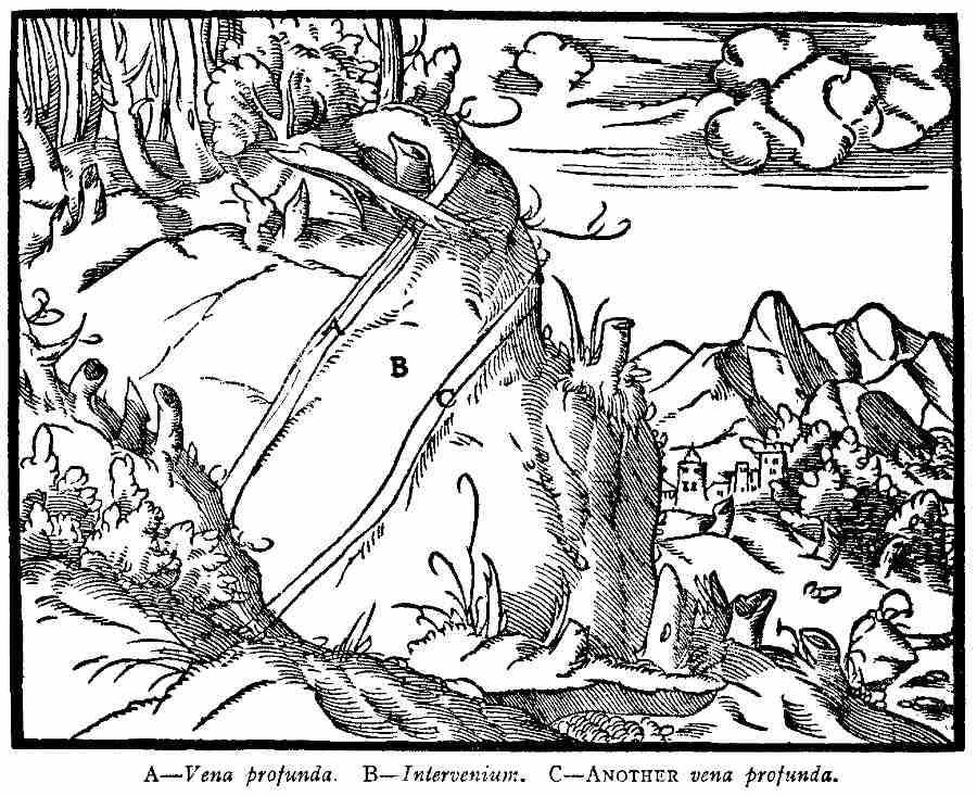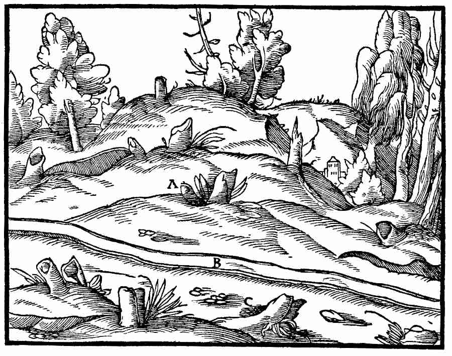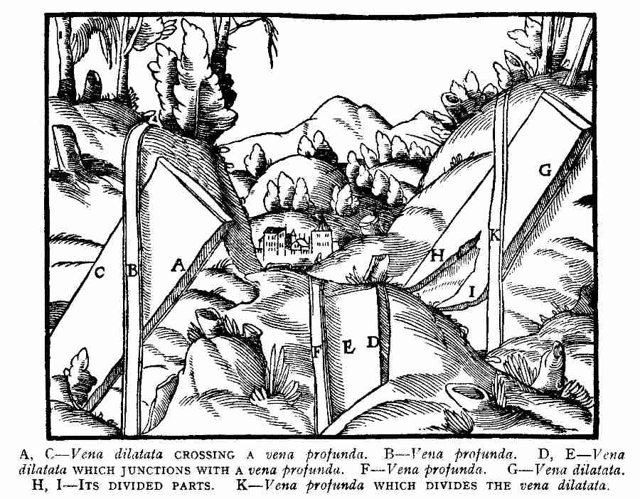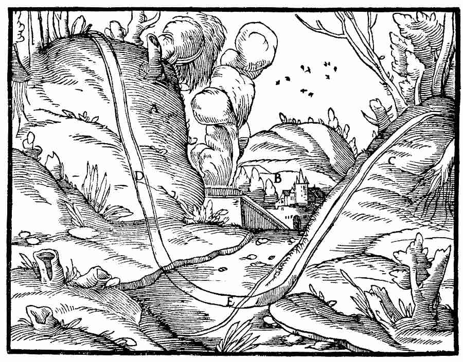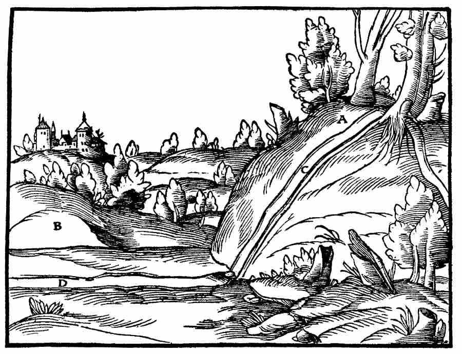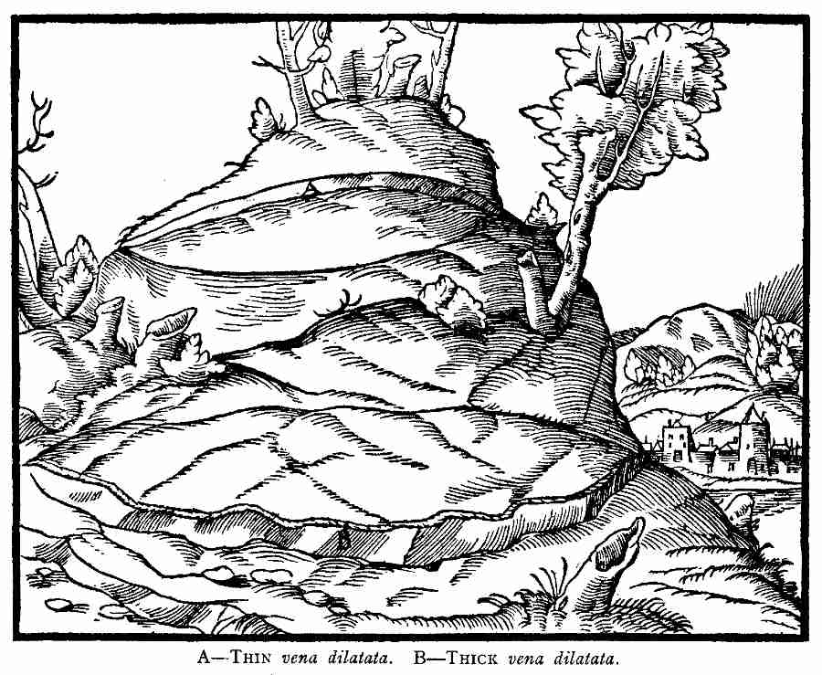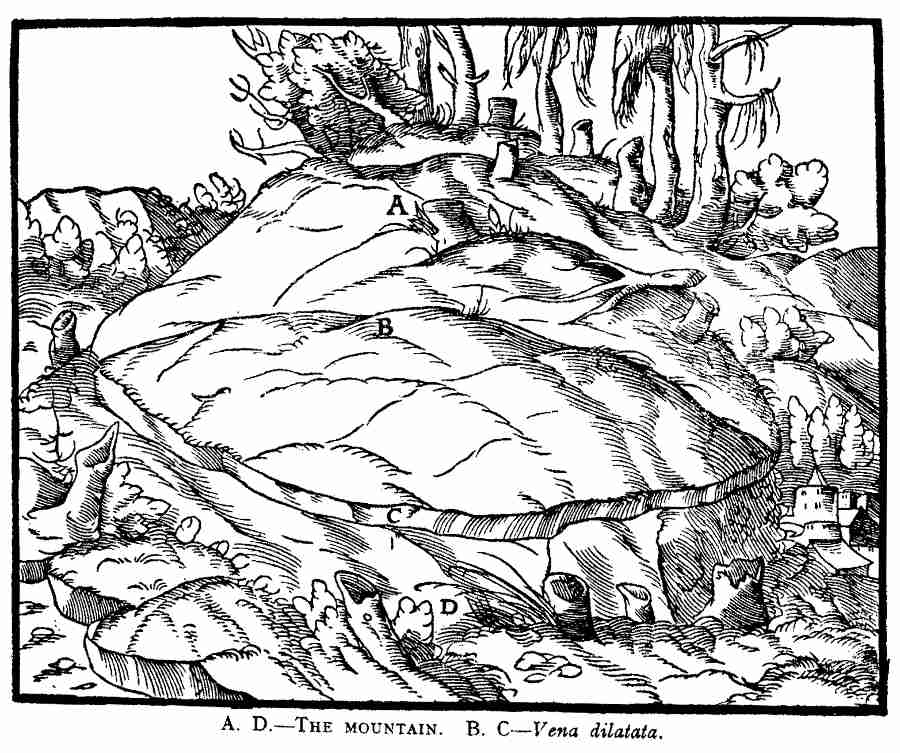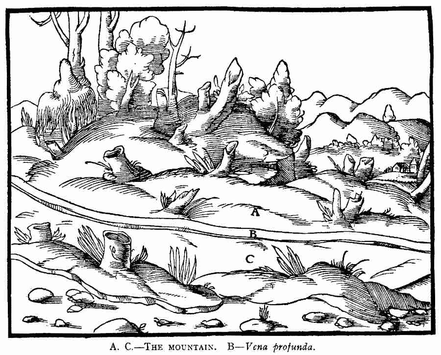 In 1544 began the publication of the series of books to which Agricola owes his position. The first volume comprised five works and was finally issued in 1546; it was subsequently considerably revised, and re-issued in 1558. These works were: De Ortu et Causis Subterraneorum, in five "books," the first work on physical geology; De Natura Eorum quae Effluunt ex Terra, in four "books," on subterranean waters and gases; De Natura Fossilium, in ten "books," the first systematic mineralogy; De Veteribus et Novis Metallis, in two "books," devoted largely to the history of metals and topographical mineralogy; a new edition of Bermannus was included; and finally Rerum Metallicarum Interpretatio, a glossary of Latin and German mineralogical and metallurgical terms. Another work, De Animantibus Subterraneis, usually published with De Re Metallica, is dated 1548 in the preface. It [Pg viii]is devoted to animals which live underground, at least part of the time, but is not a very effective basis of either geologic or zoologic classification. Despite many public activities, Agricola apparently completed De Re Metallica in 1550, but did not send it to the press until 1553; nor did it appear until a year after his death in 1555. But we give further details on the preparation of this work on p. xv. During this period he found time to prepare a small medical work, De Peste, and certain historical studies, details of which appear in the Appendix. There are other works by Agricola referred to by sixteenth century writers, but so far we have not been able to find them although they may exist. Such data as we have, is given in the appendix.