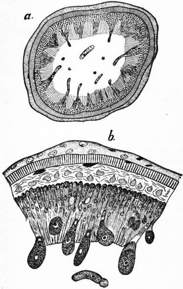 The Pine-grosbeak (Pinicola enucleator) inhabits the conifer-zone of both the Old and the New Worlds, seeking, in Europe and probably elsewhere, a lower latitude as winter approaches—often journeying in large flocks; stragglers have occasionally reached the British Islands (Yarrell, Br. Birds, ed. 4, ii. 177-179). In structure and some of its habits much resembling a bullfinch, but much exceeding that bird in size, it has the plumage of a crossbill and appears to undergo the same changes as do the members of the restricted genus Loxia—the young being of a dull greenish-grey streaked with brownish-black, the adult hens tinged with golden-green, and the cocks glowing with crimson-red on nearly all the body-feathers, this last colour being replaced after moulting in confinement by bright yellow. Nests of this species were found in 1821 by Johana Wilhelm Zetterstedt near Juckasjärwi in Swedish Lapland, but little was known concerning its nidification until 1855, when John Wolley, after two years’ ineffectual search, succeeded in obtaining near the Finnish village Muonioniska, on the Swedish frontier, well-authenticated specimens with the eggs, both of which are like exaggerated bullfinches’. The food of this species seems to consist of the seeds and buds of many sorts of trees, though the staple may very possibly be those of some kind of pine.