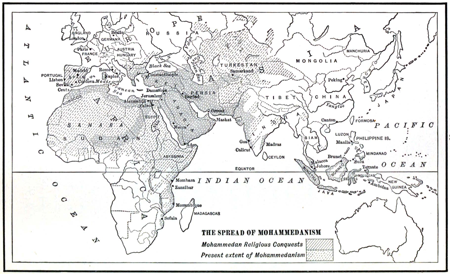 The Conversion of the Malayans to Mohammedanism.—Not only did Mohammedanism move westward over Africa and Europe, it was carried eastward as well. Animated by their faith, the Arabs became the greatest sailors, explorers, merchants, and geographers of the age. They sailed from the Red Sea down the coast of Africa as far as Madagascar, and eastward to India, where they had settlements on both the Malabar and Coromandel coasts. Thence Arab missionaries brought their faith to Malaysia.