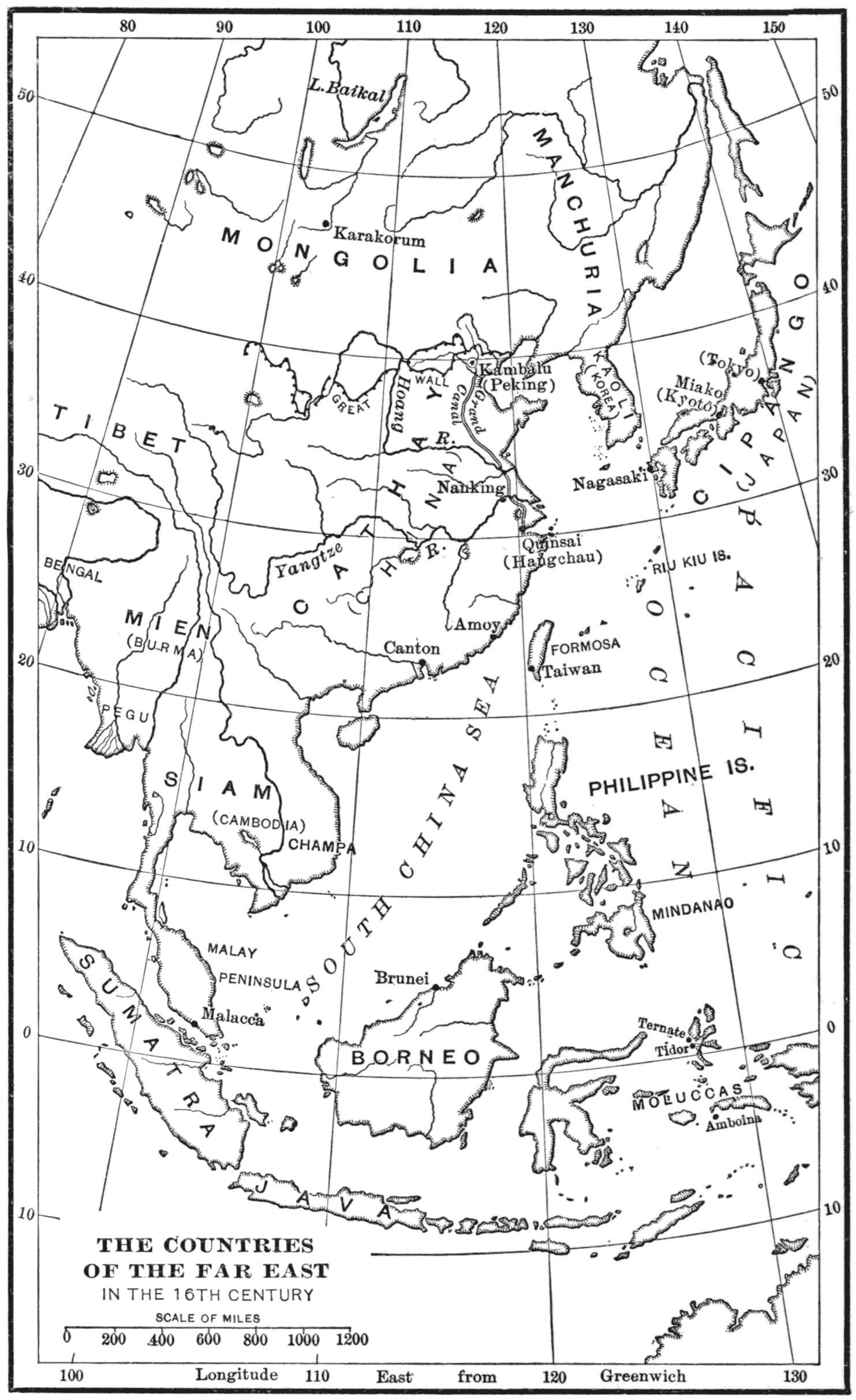 Early Civilization in India.—More than two thousand years ago, India produced a remarkable civilization. There were great cities of stone, magnificent palaces, a life of splendid luxury, and a highly organized social and political system. Writing, known as the Sanskrit, had been developed, and a great literature of poetry [37]and philosophy produced. Two great religions, Brahminism and Buddhism, arose, the latter still the dominant religion of Tibet, China, and Japan. The people who produced this civilization are known as the Hindus. Fourteen or fifteen hundred years ago Hinduism spread over Burma, Siam, and Java. Great cities were erected with splendid temples and huge idols, the ruins of which still remain, though their magnificence has gone and they are covered to-day with the growth of the jungle.