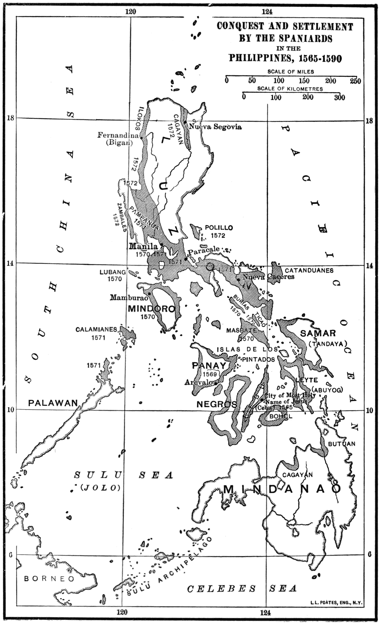 Mohammedan Settlement in Borneo.—A powerful Mohammedan Malay settlement was established on the western coasts of Borneo certainly as early as 1400. The more primitive inhabitants, like the Dyaks, who were a tribe of the primitive Malayans, were defeated, and the possession of the coast largely taken from them. From this coast of Borneo came many of the adventurers who were traversing the seas of the Philippines when the Spaniards arrived.