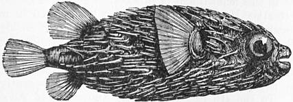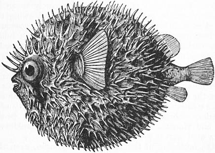 GLOBE-FISH, or Sea-Hedgehog, the names by which some sea-fishes are known, which have the remarkable faculty of inflating their stomachs with air. They belong to the families Diodontidae and Tetrodontidae. Their jaws resemble the sharp beak of a parrot, the bones and teeth being coalesced into one mass with a sharp edge. In the Diodonts there is no mesial division of the jaws, whilst in the Tetrodonts such a division exists, so that they appear to have two teeth above and two below. By means of these jaws they are able to break off branches of corals, and to masticate other hard substances on which they feed. Usually they are of a short, thick, cylindrical shape, with powerful fins (fig. 1). Their body is covered with thick skin, without scales, but provided with variously formed spines, the size and extent of which vary in the different species. When they inflate their capacious stomachs with air, they assume a globular form, and the spines protrude, forming a more or less formidable defensive armour (fig. 2). A fish thus blown out turns over and floats belly upwards, driving before the wind and waves. Many of these fishes are highly poisonous when eaten, and fatal accidents have occurred from this cause. It appears that they acquire poisonous qualities from their food, which frequently consists of decomposing or poisonous animal matter, such as would impart, and often does impart, similar deleterious qualities to other fish. They are most numerous between the tropics and in the seas contiguous to them, but a few species live in large rivers, as, for instance, the Tetrodon fahaka, a fish well known to all travellers on the Nile. Nearly 100 different species are known.