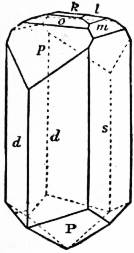 HEMIMORPHITE, a mineral consisting of hydrous zinc silicate, H2Zn2SiO5, of importance as an ore of the metal, of which it contains 54.4%. It is interesting crystallographically by reason of the hemimorphic development of its orthorhombic crystals; these are prismatic in habit and are differently terminated at the two ends. In the figure, the faces at the upper end of the crystal are the basal plane k and the domes o, p, l, m, whilst at the lower end there are only the four faces of the pyramid P. Connected with this polarity of the crystals is their pyroelectric character—when a crystal is subjected to changes of temperature it becomes positively electrified at one end and negatively at the opposite end. There are perfect cleavages parallel to the prism faces (d in the figure). Crystals are usually colourless, sometimes yellowish or greenish, and transparent; they have vitreous lustre. The hardness is 5, and the specific gravity 3.45. The mineral also occurs as stalactitic or botryoidal masses with a fibrous structure, or in a massive, cellular or granular condition intermixed with calamine and clay. It is decomposed by hydrochloric acid with gelatinization; this property affords a ready means of distinguishing hemimorphite from calamine (zinc carbonate), these two minerals being, when not crystallized, very like each other in appearance. The water contained in hemimorphite is expelled only at a red heat, and the mineral must therefore be considered as a basic metasilicate, (ZnOH)2SiO3.