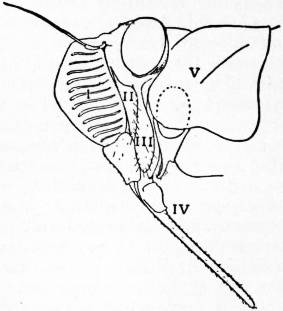 I., Frons. II., Base of mandible. III., Base of first maxillae. IV., Second maxillae forming rostrum. V., Pronotum. |