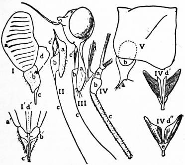 I., a, frons; b, clypeus; c, labrum; d, epipharynx. I’., Same from behind. II., Mandible. III., 1st maxillae, a, base; b, sheath; c, stylet; c′, muscle. IV., 2nd maxillae, a, sub-mentum; b, mentum; c, ligula, forming beak; d, hypopharynx (shown also from front d′, and behind d″). V., Prothorax, b, haunch; a, trochanter. |