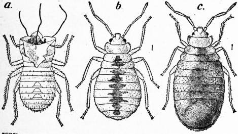 | Fig. 3.—a, Cast-off nymphal skin of Bed-bug (Cimex lectularius); b, Second instar after emergence from a; c, The same after a meal. |