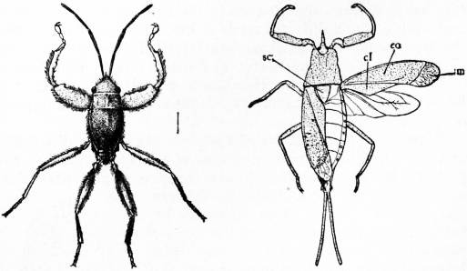 Development.—In most Hemiptera the young insect (fig. 3) resembles its parents except for the absence of wings, and is active through all stages of its growth. In all Hemiptera the wing-rudiments develop externally on the nymphal cuticle, but in some families—the cicads for example—the young insect (fig. 10) is a larva differing markedly in form from its parent, and adapted for a different mode of life, while the nymph before the final moult is sluggish and inactive. In the male Coccidae (Scale-insects) the nymph (fig. 4) remains passive and takes no food. The order of the Hemiptera affords, therefore, some interesting transition stages towards the complete metamorphosis of the higher insects.