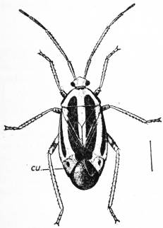 Distribution and Habits.—Hemiptera are widely distributed, and are plentiful in most quarters of the globe, though they probably have not penetrated as far into remote and inhospitable regions as have the Coleoptera, Diptera and Aptera. They feed entirely by suction, and the majority of the species pierce plant tissues and suck sap. The leaves of plants are for the most part the objects of attack, but many aphids and scale-insects pierce stems, and some go underground and feed on roots. The enormous rate at which aphids multiply under favourable conditions makes them of the greatest economic importance, since the growth of immense numbers of the same kind of plant in close proximity—as in ordinary farm-crops—is especially advantageous to the insects that feed on them. Several families of bugs are predaceous in habit, attacking other insects—often members of their own order—and sucking their juices. Others are scavengers feeding on decaying organic matter; the pond skaters, for example, live mostly on the juices of dead floating insects. And some, like the bed-bugs, are parasites of vertebrate animals, on whose bodies they live temporarily or permanently, and whose blood they suck.