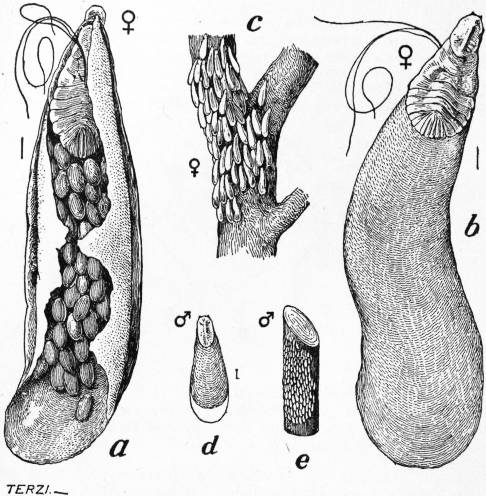 c, Section showing muscles which vibrate drum (magnified); d, A drum at rest; e, Thrown into vibration, more highly magnified. |