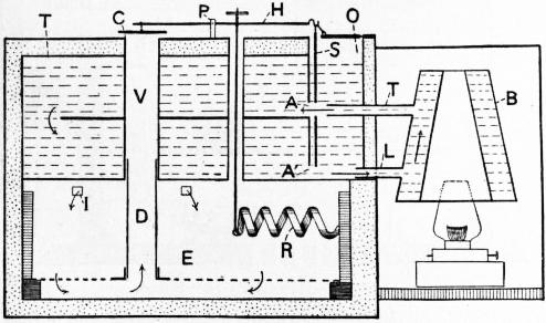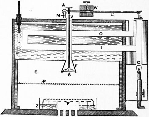Hearson, however, has constructed a “cool biological incubator,” in which by an ingenious device the expansion or contraction of the thermostatic capsule deflects a horizontal pipe (C) (fig. 12), through which cold water from an ordinary tap is kept running, in one of two directions. If it is deflected so as to open into the tube (D), the cold water passes into the tank (F), where it is warmed by a gas flame, and thence it passes into the water-jacket of the incubator. If it is deflected so as to open into the pipe (E), it then runs through the ice tank (B), containing broken ice, before passing through the water-jacket of the incubator. If it poured into neither of these pipes it then simply passes out through the pipe (H) to the waste pipe (N). By this device the temperature of the incubator can be kept constant at any desired point, even though it may be some 30° to 40° C. below that of the external air.
