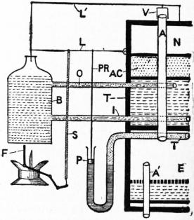 We will first describe those which act through the expansion of a liquid. A very efficient and cheap form is that described by F. J. M. Page in the Journal of the Chemical Society for 1876. The regulator consists of a glass bulb (fig. 15 B), continuous above with a tubular limb (L). At the upper part of the limb is a lateral tubular arm (A) which bends downwards and constitutes the outlet pipe. At the upper extremity of the limb there is a short and much wider tube (T), the lower end of which slides upwards or downwards along it. The upper end of this wider tube is closed by a cork and through a perforation in this a very small glass tube (G) passes downwards into the limb of the regulator to a point a short distance below the exit of the outlet tube. The exact height of the lower aperture of the small tube can be varied by sliding the wider tube up or down along the limb. The by-pass (P) consists of a transverse connexion between the inlet and outlet gas pipes, and the amount of gas which travels through the short circuit thus formed is regulated by means of a stopcock. The by-pass, however, can be formed, as suggested by Schäfer (Practical Histology, 1877, p. 80), by making an extremely small hole in the small inlet tube, a little way above its lower extremity. But unless this hole be small enough, too much gas will be allowed to pass, and a sufficiently low temperature therefore unattainable. The regulator is filled with mercury until the top of the column reaches within ½ in. of the exit of the outlet tube, the bulb is placed in the incubator chamber, and gas is allowed to pass through it. By pushing down the inner inlet tube (G) until its aperture is immersed beneath the mercury, the gas supply is cut off, with the exception of that passing through the by-pass. The stopcock is now turned until only the smallest flame exists. The inlet pipe is then raised again above the mercury, and the flame consequently increases in size. The temperature of the incubator gradually rises, and when the desired degree is reached, the inlet tube is pushed down until the end is just beneath the surface of the mercury. The 368 gas supply is thus cut off at the desired temperature. If the temperature of the incubator falls, the mercury contracts, the aperture of the inlet tube is uncovered, the gas supply is renewed and the flame increased. The temperature will then rise until the required point is reached, when the gas supply will again be cut off. A uniform temperature which oscillates within a range of half a degree is thus attained.