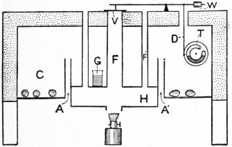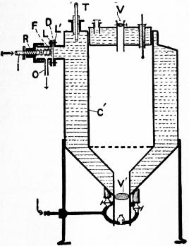 One of the best known and most generally used of the cylindrical and water-tank kind is that of Dr d’Arsonval. It consists of two copper cylinders (fig. 8 C and C′), each terminating in a cone below. Between the cylinders is a wide interspace, in order that a large volume of water may be contained. This interspace therefore constitutes the water-tank of the incubator. The upper orifice of the inner cylinder is closed by a movable double lid, which contains an interspace filled with water. The outer cylinder has an oblique form at its upper end and is permanently closed. The result attained by this slope of the lid of the outer cylinder is that the water tank, which is fed from the highest point, becomes completely filled. The aperture at the highest point of the outer cylinder is plugged with a caoutchouc plug and through a perforation in this a glass tube (T) is placed. In 365 the side of the outer cylinder below this, there is a wide and rimmed aperture, to which a gas regulator of special construction is fixed.